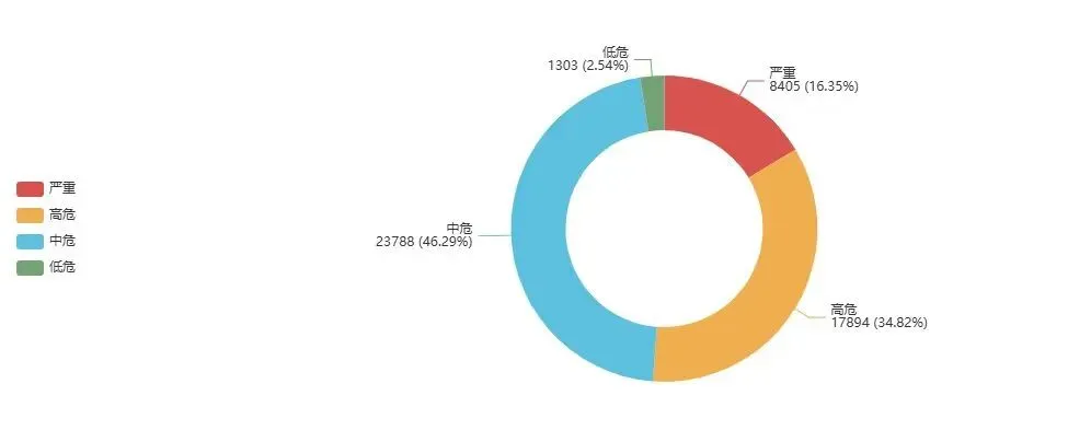 在安全漏洞的严重性分布中,我们发现中高危漏洞已经成为主要的安全威胁,占据了81.11%的惊人比例。具体来看,中等风险漏洞占据了46.29%(总数达到23788个),而高风险漏洞则占据了34.82%(总数为17894个)。