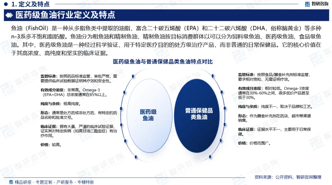 行业定义及特点:鱼油(FishOil)是一种从多脂鱼类中提取的油脂,富含二十碳五烯酸(EPA)和二十二碳六烯酸(DHA,俗称脑黄金)等多种n-3系多不饱和脂肪酸。医药级鱼油是一种经过科学验证、用于特定医疗目的的处方级治疗产品,而非普通的日常保健品。它的核心价值在于其高浓度、高纯度和坚实的临床证据。