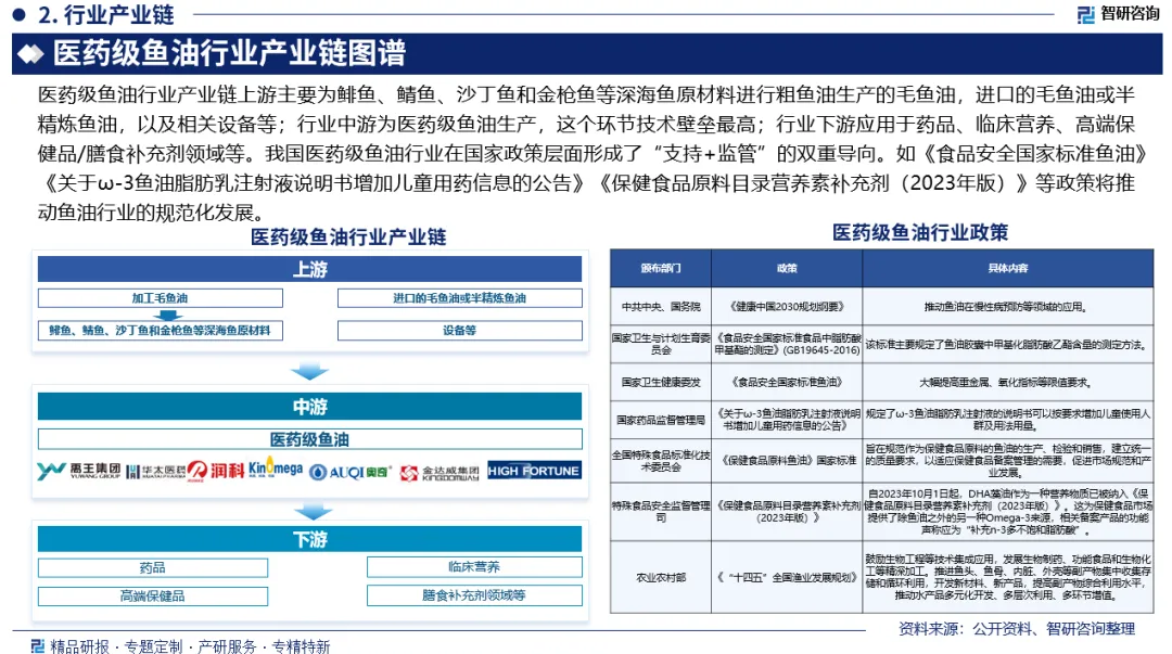行业政策:我国医药级鱼油行业在国家政策层面形成了“支持+监管”的双重导向。如《食品安全国家标准鱼油》《关于ω-3鱼油脂肪乳注射液说明书增加儿童用药信息的公告》《保健食品原料目录营养素补充剂(2023年版)》等政策将推动鱼油行业的规范化发展。