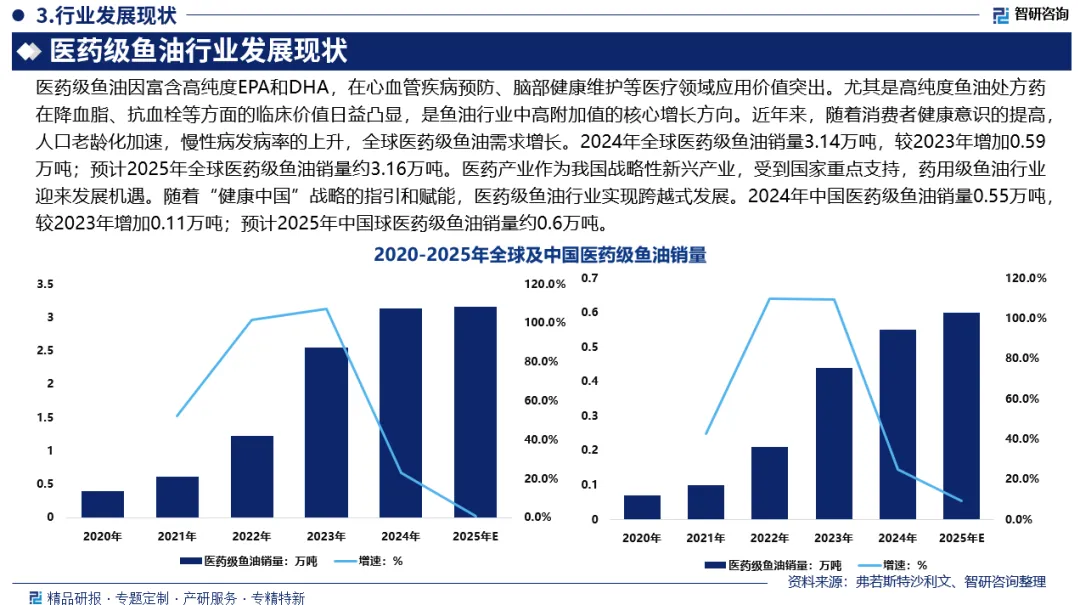 市场趋势:中国医药级鱼油行业正迈向一个“高质量、强证据、精细化、全球化”的新发展阶段,应用趋势正朝着精准化、多元化和循证化的方向飞速发展。