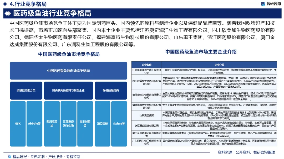 竞争情况:中国医药级鱼油市场竞争主体主要为国际制药巨头、国内领先的原料与制造企业以及保健品品牌商等。随着我国政策趋严和技术门槛提高,市场正加速向头部聚集。国内本土企业主要包括江苏奥奇海洋生物、四川欣美加生物医药、德阳华太生物医药、福建海富特生物、山东禹王集团、浙江医药、厦门金达威集团、广东润科生物等。