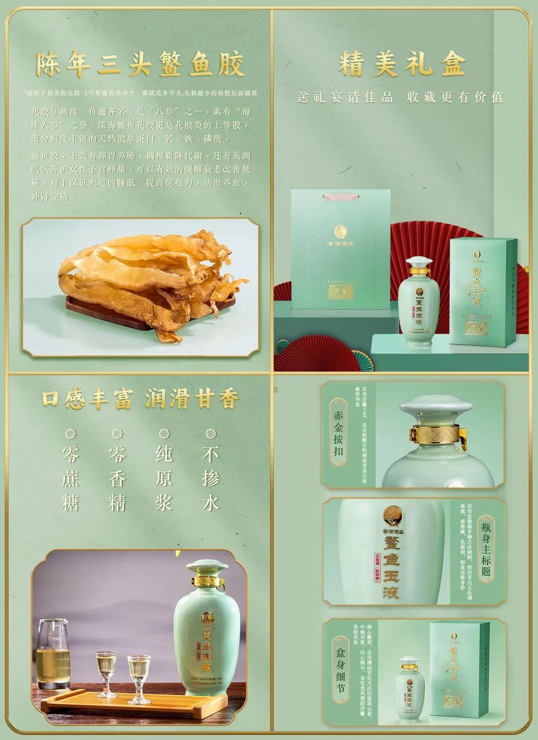 秘制佳酿,特色好酒。采用纯五粮酒为基酒加以陈年鳘鱼胶(花胶)炮制而成。鱼胶(花胶)含有丰富的高级胶原蛋白和多种维生素是滋补圣品。酒色金黄如琥珀,晶莹通透;口感丰富、润滑甘香。