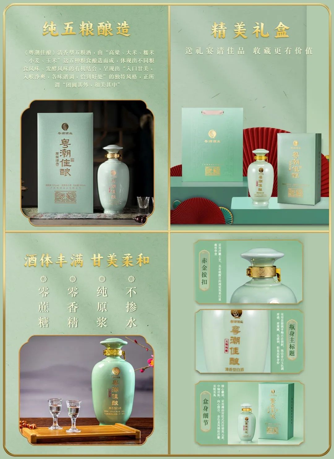 以粤酒酒业酿造的粤潮佳酿(五粮酒)为基酒,辅之陈年鳘鱼胶(花胶)炮制而成。
