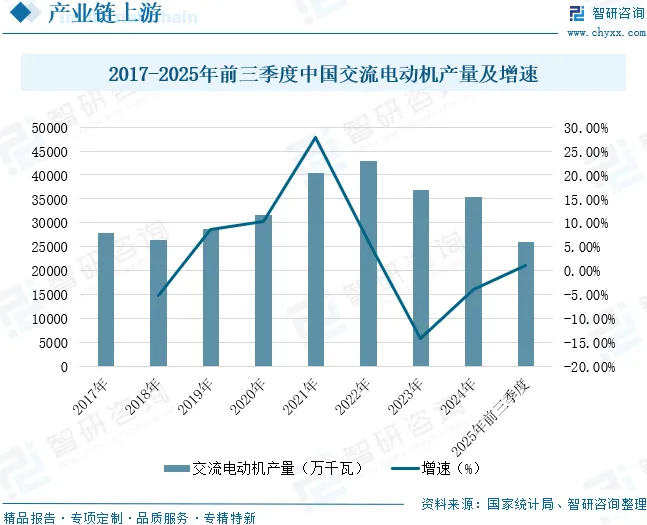 电动机是把电能转换成机械能的一种设备。它是利用通电线圈(也就是定子绕组)产生旋转磁场并作用于转子(如鼠笼式闭合铝框)形成磁电动力旋转扭矩。电动机按使用电源不同分为直流电动机和交流电动机。以交流电动机为例,作为电动机领域的关键分支,交流电动机通过交流电驱动实现旋转运动,广泛应用于工业、农业、交通、国防等多个领域。近年来,受国内外经济环境变化影响,传统制造业投资增速放缓,部分行业出现产能过剩的情况,导致这些行业对电动机的需求量下降,从而影响了交流电动机的产量。2024年中国交流电动机产量为35321.7万千瓦,同比下降4.05%。2025年前三季度,中国交流电动机产量为26041.9万千瓦,同比增长1.1%。作为航空电机系统的重要上游环节,交流电动机的产量波动直接传导至航空领域,影响航空电机系统的原材料供应稳定性与生产成本控制。