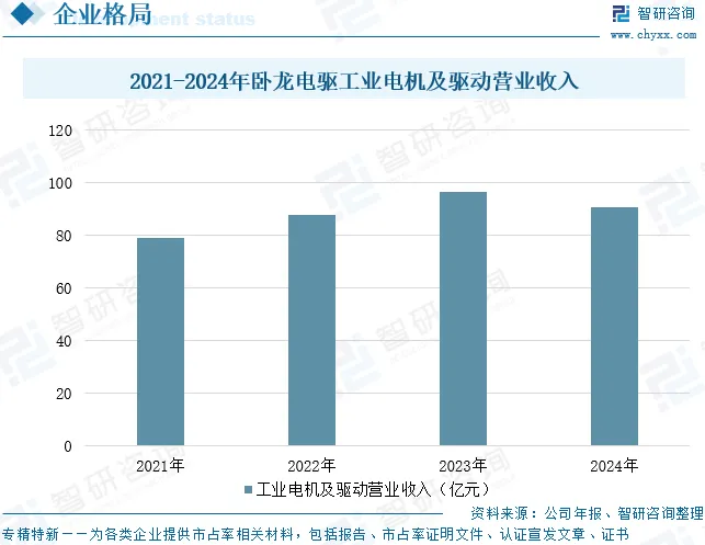 卧龙电气驱动集团股份有限公司主要业务为电机及控制的研发、生产、销售和服务,可以应用于防爆、暖通、工业、新能源交通等领域,同时公司积极布局包括机器人组件和人工智能等在内的新兴领域。电机及控制业务是公司的关键核心业务。公司并购了数家海外知名电机及控制类产品制造企业和国内大型电机龙头企业南阳防爆,在全球化制造布局和营销服务网络、销售规模、产品覆盖面、技术创新能力以及品牌影响力等方面均具有明显的行业竞争优势。通过对国外公司的品牌和技术优势与国内公司的制造成本优势的融合,公司的市场号召力得到了大幅提升,形成了对竞争对手的持续压迫。作为全球领先的电机及驱动类产品制造商,公司在高压驱动整体解决方案、新能源汽车驱动电机、高端和超高端家用电机、振动电机等领域已经逐步取得了行业的全球领导权。数据显示,2024年卧龙电驱工业电机及驱动营业收入为90.66亿元,同比下降6%。