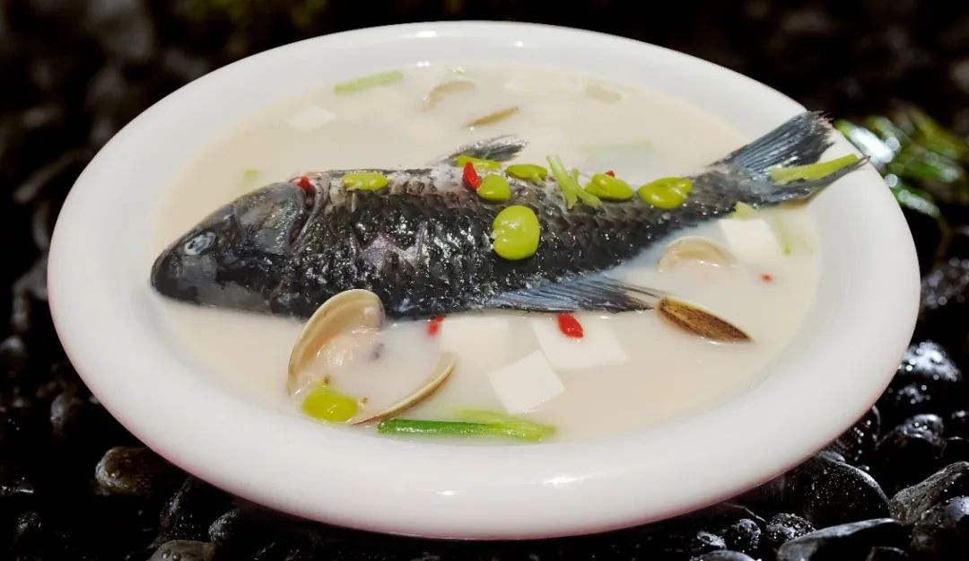 白鲫鱼泉水炖煮,肉质细腻绵密,汤汁鲜甜味浓,新鲜蚕豆营养丰富、软糯可口。