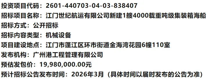 船海装备网消息,2026年1月30日——江门世纪航运有限公司今日正式公布了其新建一艘4000载重吨级集装箱海船项目的招标计划,标志着该项目在完成备案后,已进入实质性的建造采购阶段。