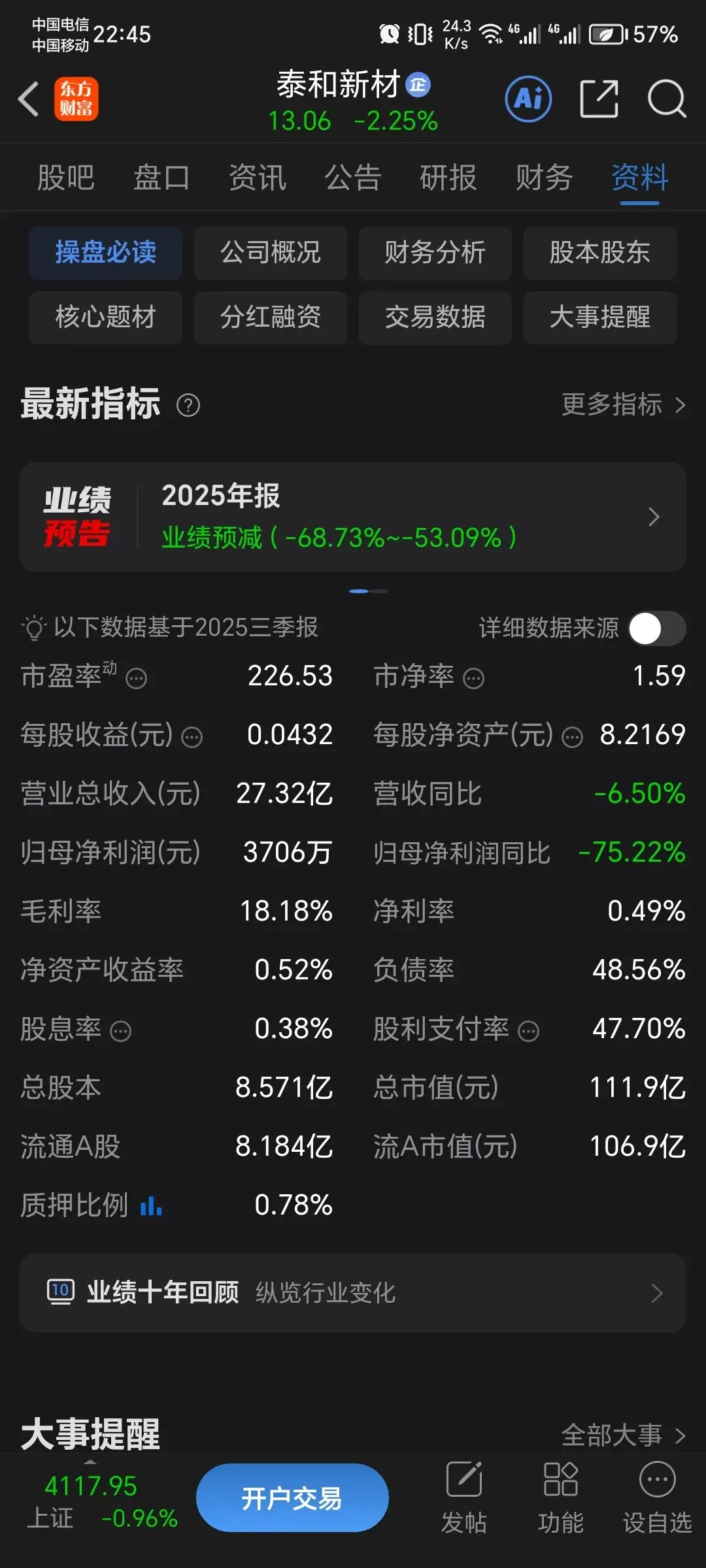 截至 2026 年 1 月 30 日收盘,泰和新材股价为13.06 元,较前一交易日下跌 2.25%,总市值111.93 亿元,市盈率 TTM**-487.89 倍 **,市净率1.43 倍。
