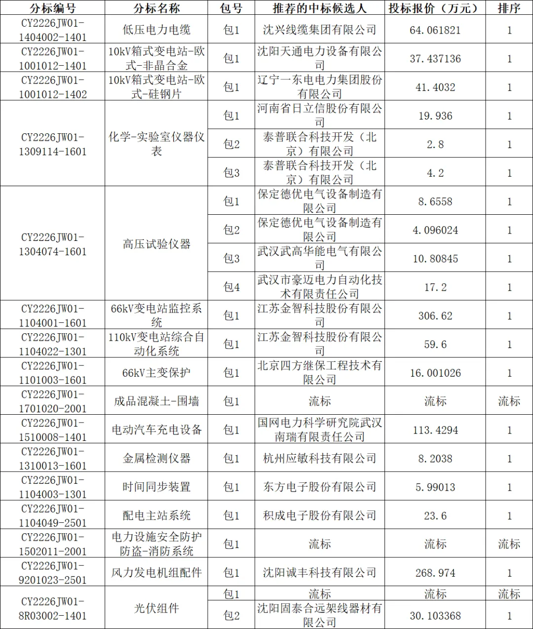 国网辽宁省电力有限公司2026年原集体企业和各级产业单位市场化项目物资第一次、第二次公开招标采购评标工作已经结束,依据《中华人民共和国招标投标法实施条例》、《招标公告和公示信息发布管理办法》对中标候选人公示的规定,现将评标委员会推荐的中标候选人予以公示,公示期3日。投标人或者其他利害关系人若对评标结果有异议的,请在中标候选人公示期间以书面形式(传真)提出。