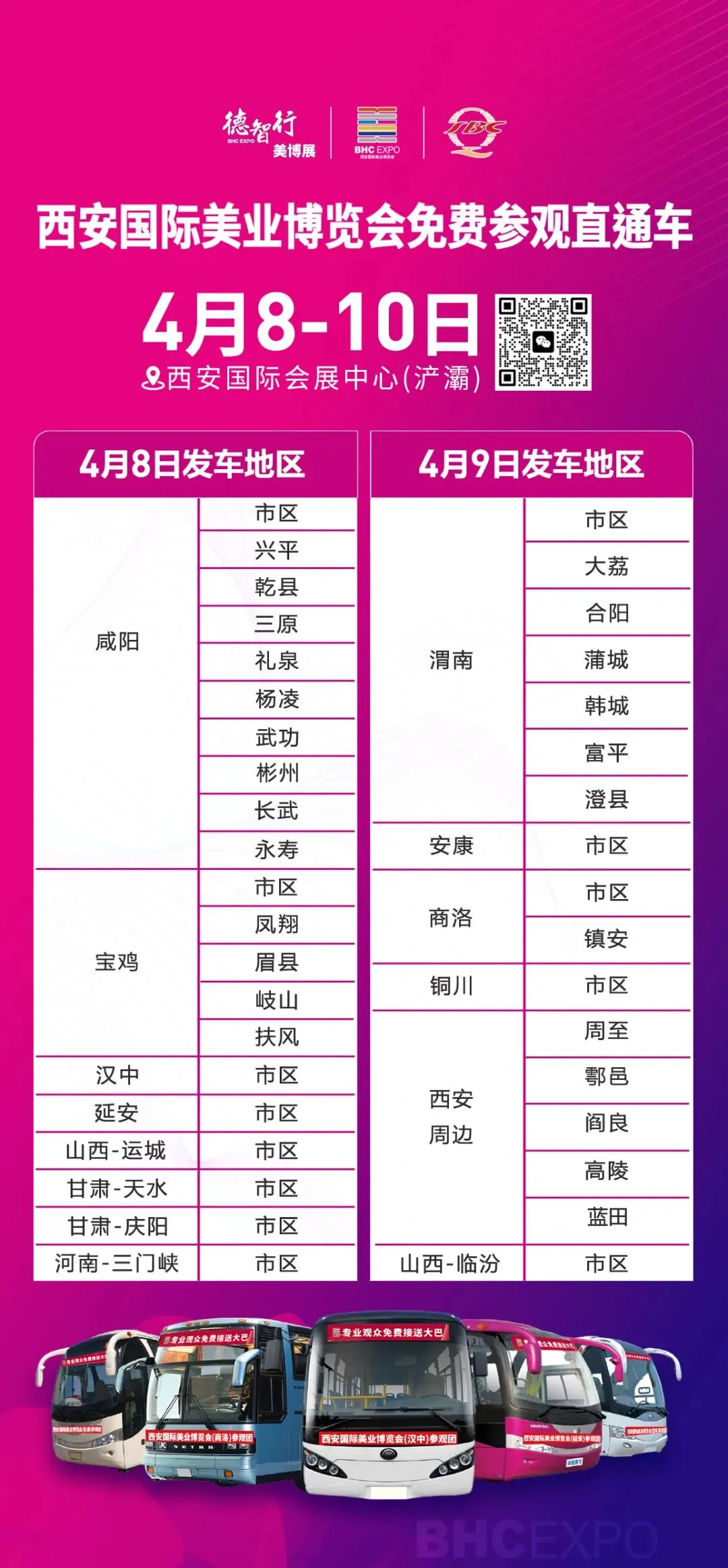 为更好的服务美业同仁,现已开通各地市、县免费大巴参观直通车,座位有限,先报先定!您可以通过以下方式预定座位: