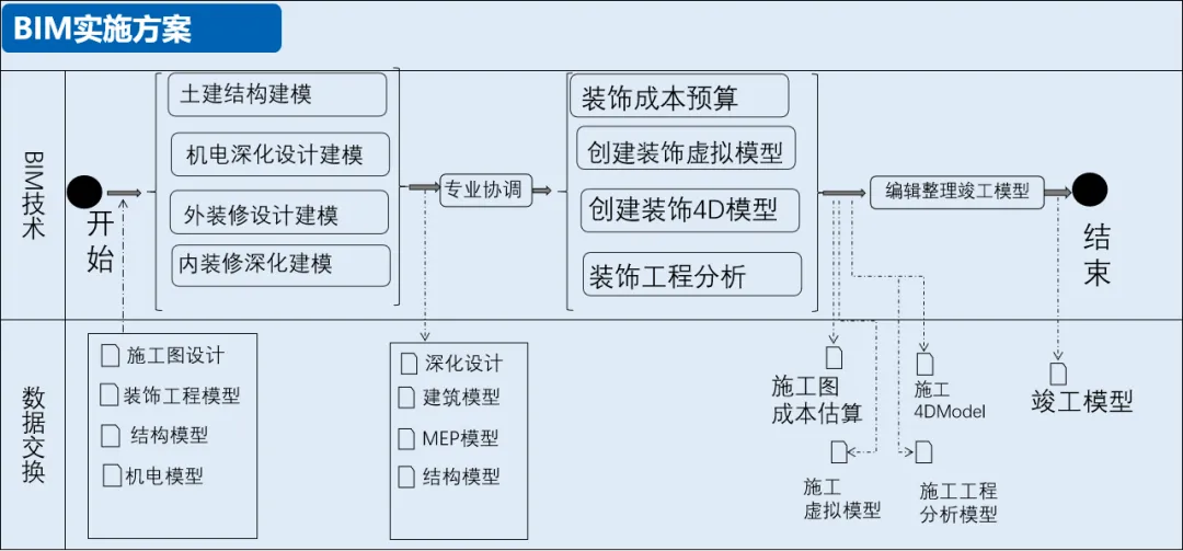 根据项目运行的最基层的需求,BIM技术小组,拟定了BIM执行的技术路线,列出BIM技术运行最基本的软件与硬件条件的需求。
