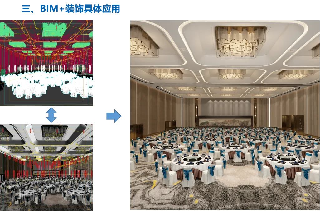 BIM技术在绍兴国际会展中心的应用情况:绍兴国际会展中心装饰工程BIM应用跨越装饰概念设计方案、施工图与深化设计阶段、全程装饰装修施工阶段;BIM技术得到落地应用,BIM深化阶段解决了装饰材料排版、装饰龙骨排布设计、装饰工程边口、接口、转角等部位优化与细化的问题,保证了装饰工程风格、构造合理安全、材料节约的目标;