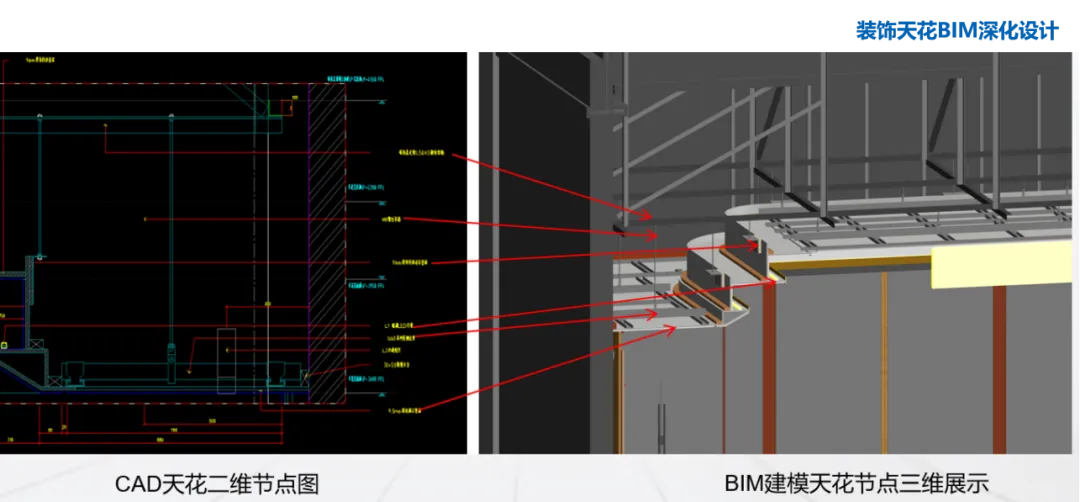 BIM+施工组织方案优化,改变原有的文本展现方式,让施工组织方案更直观; BIM+装饰材料数控加工技术提高了材料的加工精度与品质;BIM物料统计支持成本管理,为预算部门提供物料统计参照数据;BIM漫游动画、装饰构造展示动画、节点安装工艺动画、施工工序动画让工程技术不再抽象,提升大家对工程理解的深度,提高大家现场施工阶段管控的效率。