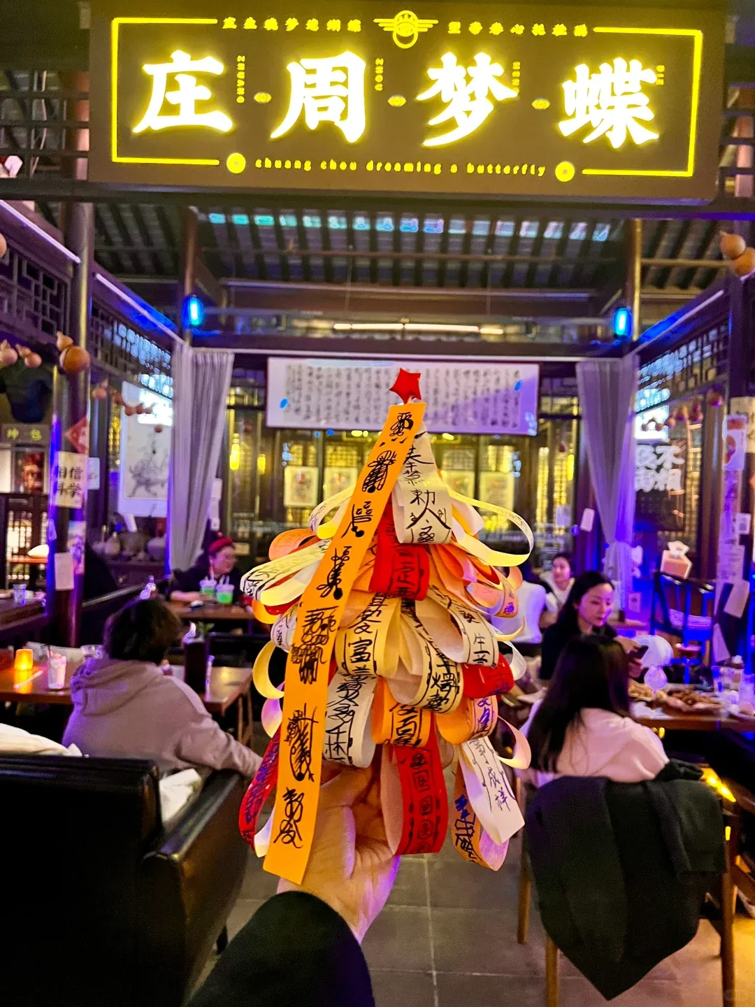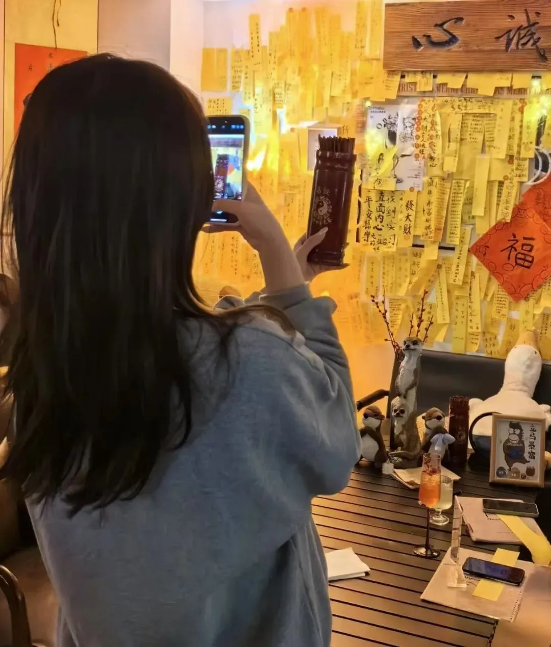 酒吧大厅中贴着对联和福字,最醒目的是满墙的黄色符纸,上面尽是客人随手写下的心愿和祝祷。