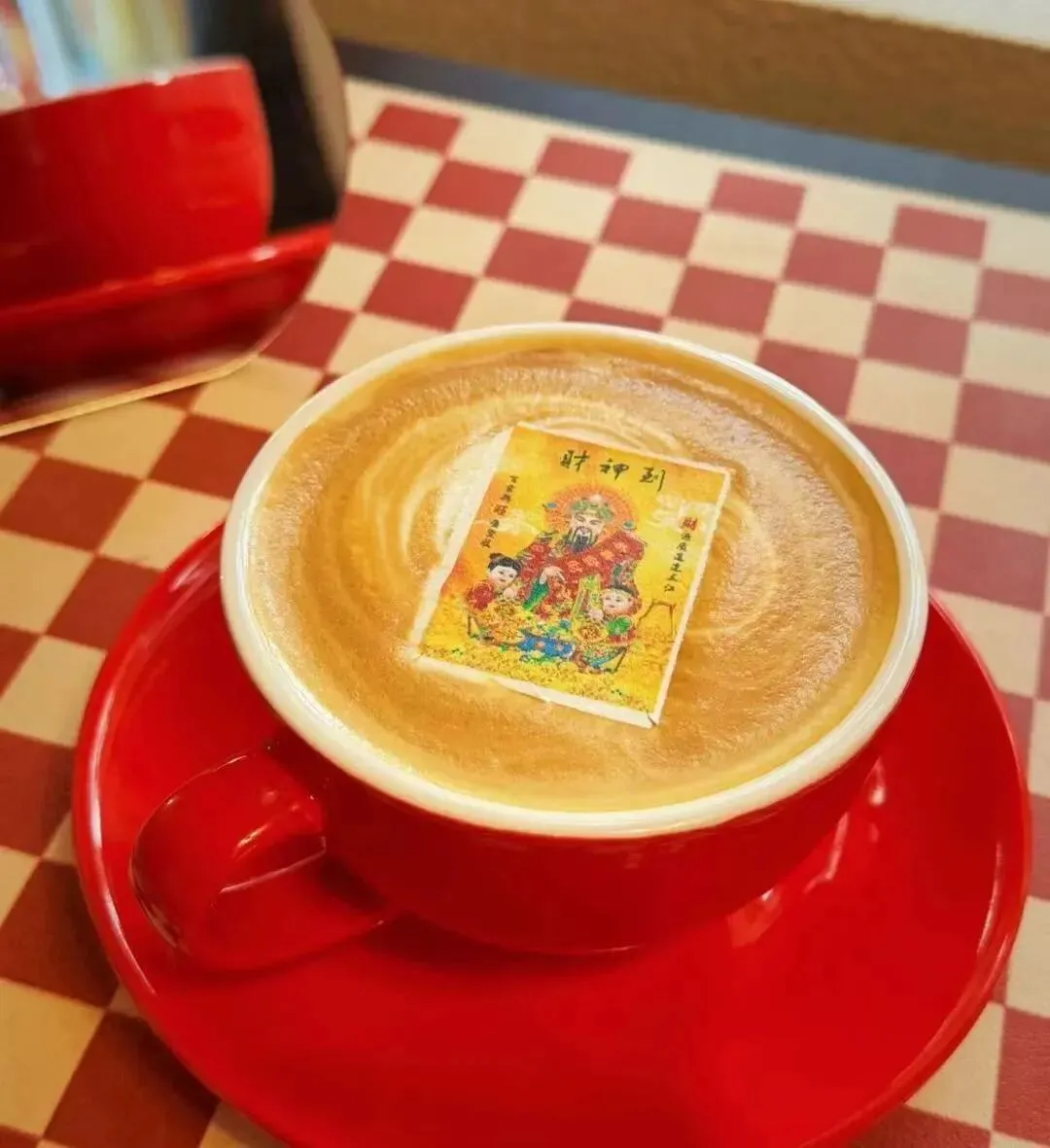 像是结合龙年“龙行大运”体彩刮刮乐的咖啡,咖啡上专门拉出龙形图案的拉花;大年初五推出了“财神拿铁”,即在咖啡拿铁的泡沫上放一张“财神到”的可食用纸画。