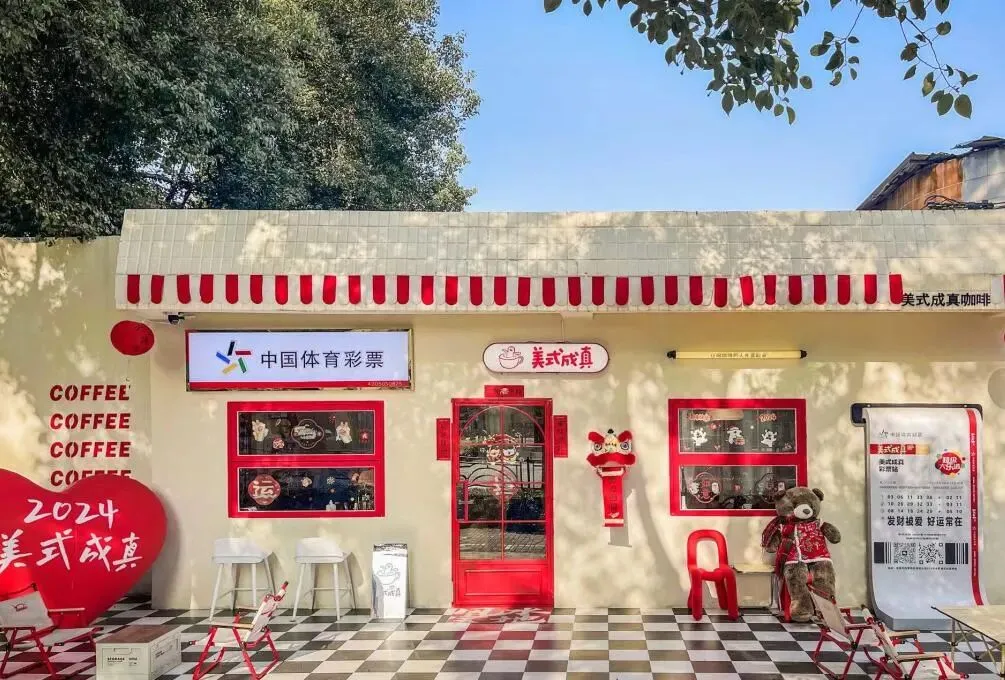 奶黄色的小房子、红色的门窗,店门口放着一只身穿花棉袄的巨大毛绒玩具熊。从装修风格就能看出,这是一家温馨的咖啡店。但在大门“美式成真”的招牌旁,还挂着显眼的“中国体育彩票”牌子,让这家咖啡店有些与众不同。