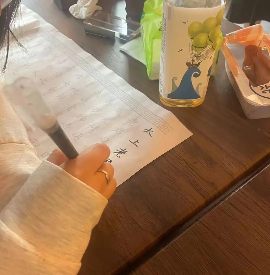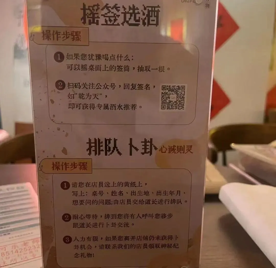 落座后,店员会给每桌客人一张黄纸、一支笔,客人可以把心中困惑写在上面,随后扫码进入占卜群,线上排队等着解签。