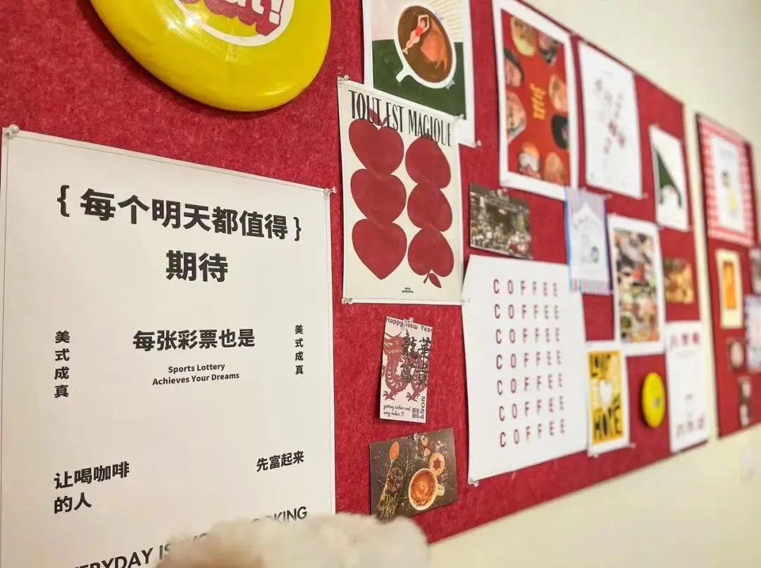 店内用一些卡通人物、财神挂件及手办来装饰店面。有顾客一边喝咖啡一边刮彩票,如果中奖了,兑奖时店员会把中奖的彩票贴在招贴板上,招贴板上写着“永远相信,美好的事情,即将成真”。