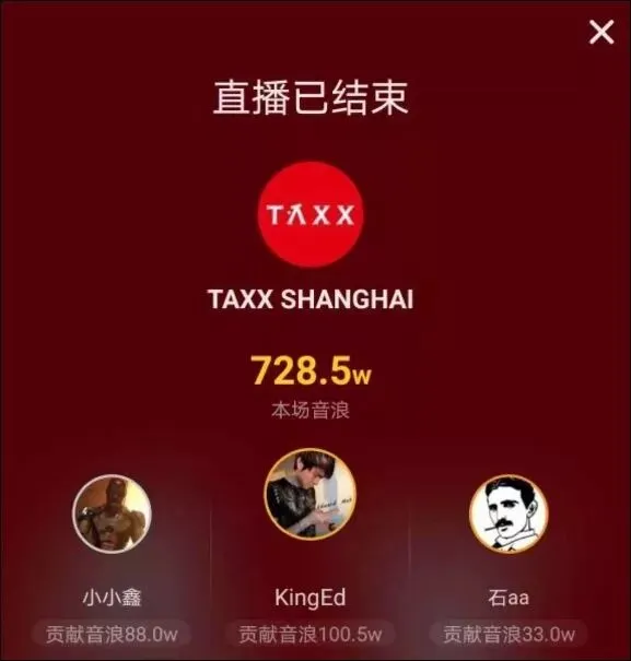 据统计,本次TAXX直播时长4小时,最高在线人数7.1万人,打赏总收入达到728.5万音浪(折算为人民币70多万元)。其中,打赏榜单前三的打赏音浪分别达到100.5万、88万和33万。