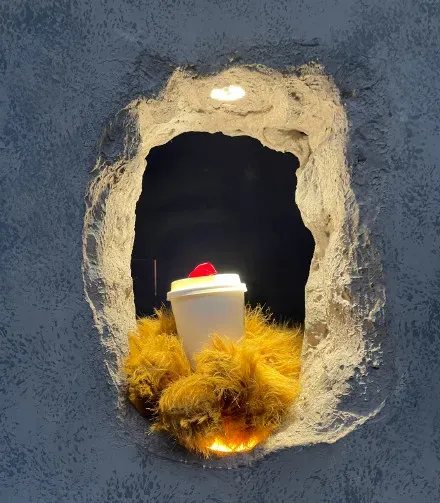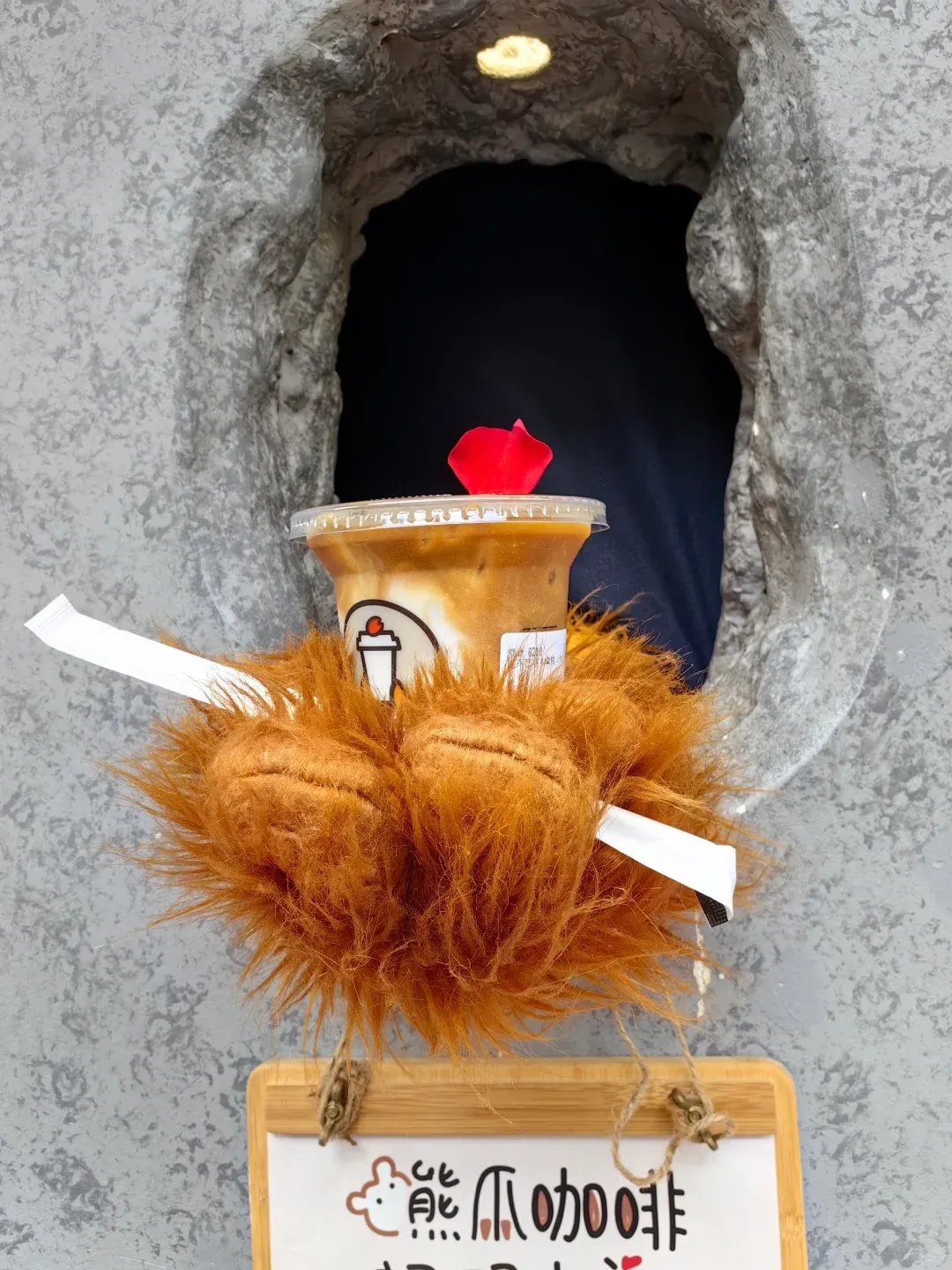 洞口不时会冒出一只熊爪,捧出一杯咖啡,有时也会顺带着送上一支鲜花,或是跟顾客来一次爱的击掌。