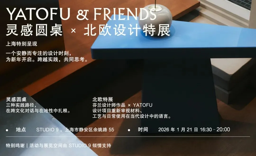 2026年新年伊始,由跨文化设计工作室 Yatofu Creatives也兜设计策划的“Yatofu & Friends 灵感圆桌 × 北欧特展”在上海设计地标 STUDIO 9 顺利举行。本次活动以「北纬之间」为主题, Yatofu邀请了设计路上的挚友——间则jianze与loof.design,与现场展出的北欧设计师的作品,共同探索设计生成的思考层次。通过空间展陈与深度对话,三组创意团队与现场观众共同探讨了在当代语境下,设计如何突破地域标签,通过材料研究、视觉叙事及空间重构,转化为可感知的文化经验与生活方式。