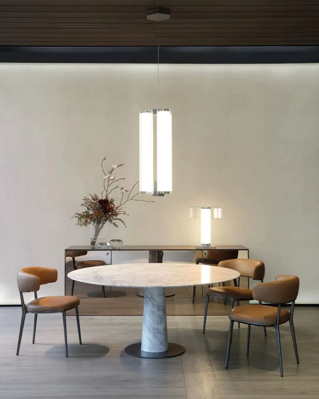 “对于全新的餐饮空间提案,我主要聚焦于材质。全新的 Luminor 储物单元采用 PVD 工艺,以精炼的香槟金或玫瑰金配色呈现,顶部覆以玻璃面板:它们之间独立存在,无需隐匿,却能融入任何环境——无论是古典还是当代风格,都能与之展开对话。完全由大理石雕琢而成 Kalystrus 餐桌则也秉持着同样的极致理念:台面由如立柱般的坚实元素支撑,独立于周遭室内环境的风格特质,成为空间中的恒定锚点。”