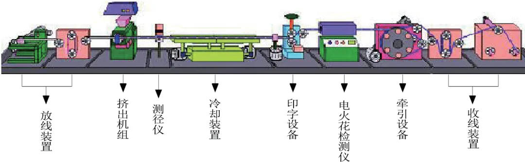 电线电缆生产线包括:放线装置、挤出机组、测径仪(线径检测设备)、冷却装置、印字设备、牵引设备、收线装置,也可根据具体生产要求添加检测设备,如偏心度测试仪、电火花检测仪、表面光洁度(凹凸)检测仪等。高铁稀土铝合金成缆生产系统总体结构如图1所示。