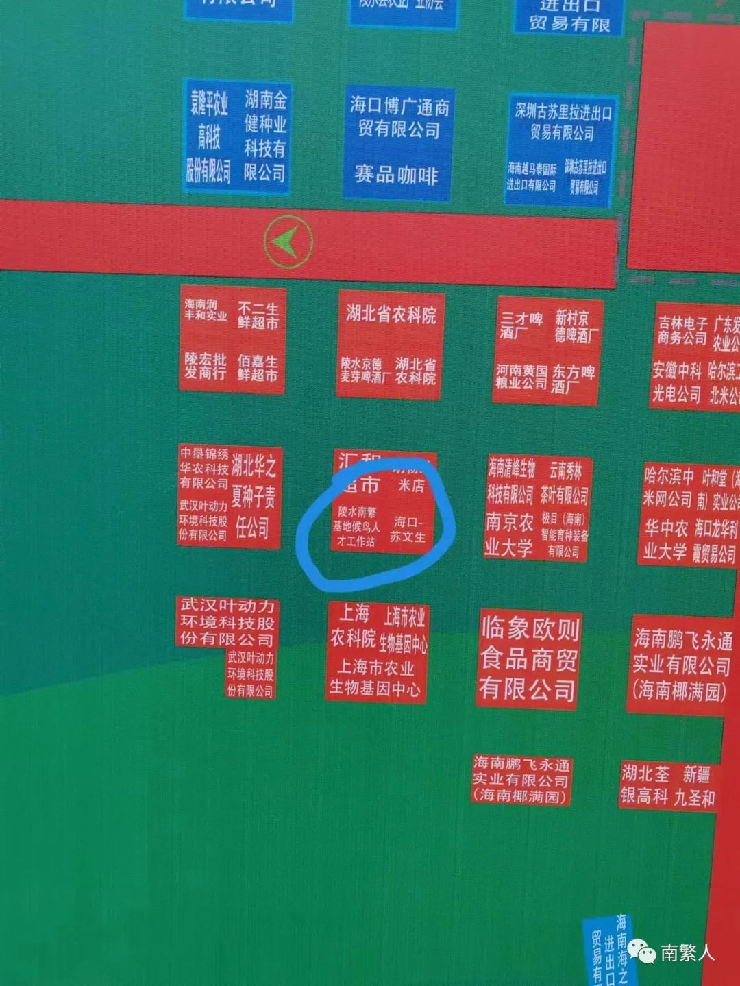 沿着滨河南路往西北走不远处为陵水县文体广场北门。走进北门,第一个展示大牌立在门的左侧。显示各参展单位,一眼就看见“陵水南繁基地‘候鸟’人才工作站。