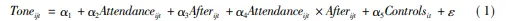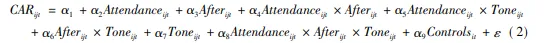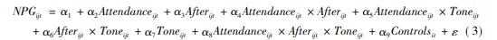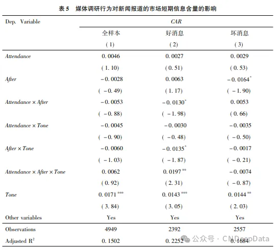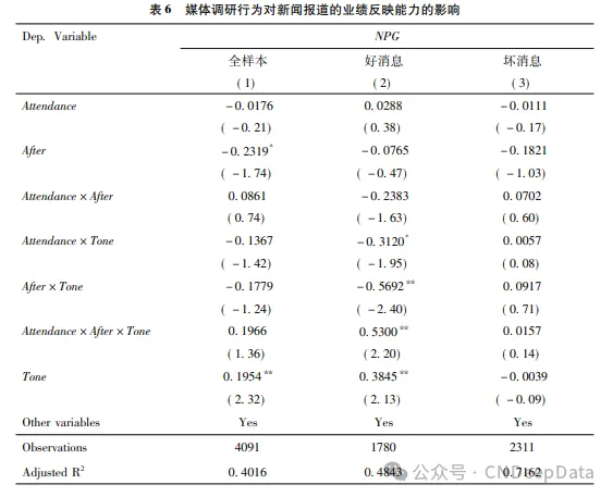 1. 因变量 参照以往文献( You et al. ,2018; Ru et al. ,2020; 薛健和汝毅,2020) ,本文从媒体报道 语气以及信息含量两个方面对新闻报道质量进行研究。首先,遵循 Piotroski et al. ( 2017) 、Ru et al. ( 2020) ,本文构建了情感倾向得分指标 Tone,衡量方式为: ( 正面句子数 - 负面句子数) /( 正面句子数 + 负面句子数 + 1) 。该指 标越高( 低) ,表明新闻报道语气越正面( 负面) 。新闻报道情感是衡量新闻报道质量最为 重要的指标之一。新闻报道越负面,越具有价值( You et al. ,2018; Call et al. ,2021) 。其次,本文使用媒体发布新闻日附近[0,1]窗口期的累计超额收益率 CAR 与新闻报 道情感( Tone) 的相关性作为测度新闻报道的信息含量的指标。理想状态下,更有价值的情感应当与窗口期内的市场收益更加紧密相关。本文采用市场调整法计算 CAR。每天的 超额收益率 = 公司收益率 - 按流通市值加权的市场综合收益率。对于新闻发布日不是交 易日的情形,本文将相应日期递延至下一最近交易日。最后,本文以净利润增长率( NPG) 为因变量,考察新闻报道情感( Tone) 与该变量的 相关性,作为报道信息含量的另一重要指标。净利润增长率( NPG) 是备受国内投资者关 注的重要业绩指标之一。根据 Tetlock( 2008) 、Li( 2014) 、You et al. ( 2018) 的研究逻辑,如 果新闻报道具有更高的信息含量,其新闻报道情感更能充分地反映公司经营业绩的变化。 2. 自变量 调研媒体( Attendance) : 如果媒体在观察期内对公司进行调研则取值 1,否则为 0。调研日后( After) : 如果新闻报道在调研日之后则取值 1,否则为 0。首先检验了媒体调研后新闻报道情感的变化。本文按照模型( 1) 进行了回归分 析,并按照调研日超额收益率是否大于 0 进行分组回归。回归结果如表 4 所示1。第( 1) 列表示全样本的回归结果,该交乘项的系数为正,并且在 1% 的水平下显著,这说明参与 公司调研使得媒体的语气更具乐观性。分组回归结果如第( 2) 、( 3) 列所示。第( 2) 列的 结果显示,当公司公布好消息时,该交乘项系数不显著,即此时调研媒体在参与调研后其 新闻报道情感同非调研媒体相比并没有出现显著的乐观性。第( 3) 列的结果显示,当公 司公布坏消息时,该交乘项系数显著为正。这说明此时媒体参与调研使得其新闻报道具 有乐观性。此外,交乘项系数也具有显著的经济含义。全样本中,媒体参与调研后其新闻 报道情感相对样本均值平均提升 26. 46% ,而在坏消息的样本中对应比例为 50. 78% 。本文进一步检验媒体记者参与调研之后的新闻报道情感与短期市场反应的相关性, 从而确认在何种情形下媒体报道情感能够更加及时充分地反映公司同期股价信息。本文 按照模型( 2) 对样本进行了回归,依然按照公司调研日附近超额收益率是否大于 0 进行 分组。回归结果如表 5 所示。结果表明,整体而言调研媒体与非调研媒体报道情感的短 期市场信息含量没有显著差异。然而,分组结果显示,当公司公布好消息时,Attendance × 1 由于篇幅限制,表 4 及后文控制变量的系数及其显著性结果在正文中不予列示。After × Tone 的系数在 5% 的显著性水平下为正; 而在公司公布坏消息时,该交乘项的系数 并不显著。这一结果说明,当公司公布好消息时,调研媒体报道情感更好地反映短期股价 信息,这符合“信息发现说”的预期。而当公司公布坏消息时,调研媒体扭曲了报道的真 实情感( “报道偏差说”) ,并未发挥其潜在的获取价值性信息线索的优势