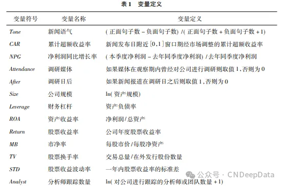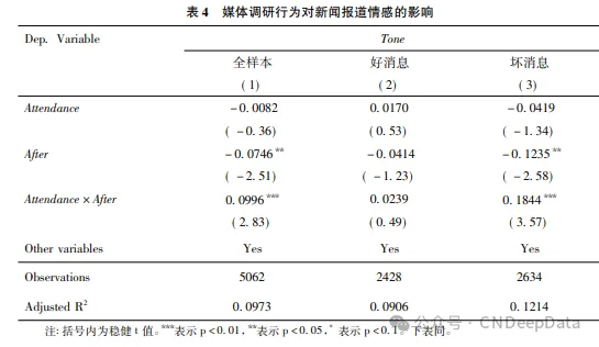 本文以 2007 - 2019 年媒体记者参与的上市公司调研活动作为研究对象,实证检验了 媒体记者与公司管理层直接沟通对媒体报道质量的影响。实证结果表明,调研媒体的报道语气整 体更加乐观,集中体现在公司公布坏消息的情形之下。此外,仅当公司公布好消息时调研媒体的 报道信息含量更高,而当公司公布坏消息时调研媒体的报道信息含量与非调研媒体没有显著差 别。以上结果表明,媒体记者同管理层沟通后信息的阐述方式视调研所获取信息的性质而有所不 同。进一步研究发现,分析师、机构投资者或者记者同行的共同参与,以及良好的公司信息环境能 够帮助调研媒体改善新闻报道质量。参与公司调研是媒体维持和拓展经济业务的重要途径。在 使用处理效应模型纠正变量自选择偏差及一系列其他稳健性检验之后,研究结论仍然成立。本文 为媒体记者和上市公司管理层直接沟通所带来的经济后果提供了经验证据。本文的研究样本涉及 2007 - 2019 年媒体参与的公司调研事件,主要通过两种途径获 得。一方面,在 2012 年 7 月之前,上市公司在定期报告中对相关信息进行披露,这部分数 据来源于数行者科技公司( Datago) 开发的年报披露投资者调研数据库( CSVD) 。另一方 面,2012 年 7 月 17 日起,深交所要求上市公司在活动日结束后两个工作日( 交易日) 内将 投资者关系活动记录表上传至深交所互动易网站,这部分数据来源于 CSMAR 投资者关 系活动数据库。本文筛选出参与方中包含媒体的投资者关系活动,这些样本涉及特定对象 调研、实地调研、媒体采访、新闻发布会等活动类型,均十分契合公司调研的研究主题1。进一步地,本文将样本媒体限定在《中国证券报》《上海证券报》《证券时报》《证券日 报》《第一财经日报》《21 世纪经济报道》《中国经营报》和《经济观察报》八家财经媒体。这些媒体在资本市场上具有重要的舆论话语权和市场地位,在以往文献中被普遍作为典 型样本予以研究( 例如: 王木之和李丹,2016; You et al. ,2018) 。而在参与公司调研的媒 体中,这些媒体具有相当的代表性,占绝大多数,如表 2 所示。本文所使用的新闻数据来源于数行者科技公司( datago) 开发的报刊新闻量化舆情数 据库( CNAD) 。该数据库囊括了所有 A 股上市公司的新闻,通过机器学习的方法将新闻 中每个句子所表达的情感倾向性分为正面、中性和负面三类,并进一步判定每一篇新闻报 道的情感色彩。本文所使用的其他控制变量均来自 CSMAR 国泰安数据库参考 Cheng et al. ( 2016 ) ,本文采用基于事件研究的双重差分( difference - in - differences,DID) 模型,将实验组的媒体定义为参与公司调研的财经媒体,控制组媒体定义 为未参与公司调研的财经媒体,分别保留调研日前后的观察期窗口并构造回归样本,检验 两组媒体在调研日前后新闻报道特征的差异性变化。本文保留活动日前后[- 180,30]窗口期内的新闻报道进行回归分析。上市公司可 能有多次媒体参与的调研事件。本文剔除在多个窗口期均出现的新闻报道样本,从而确 保每一篇新闻报道仅隶属于一次调研事件。为了更加符合 DID 模型的特征,本文进一步 要求: 每家媒体在调研日前后分别至少有一次报道,且在调研前后每一个窗口期内调研媒 体和非调研媒体也均分别至少有一次报道。首先,为检验媒体记者参与公司调研对新闻报道情感的影响,本文以新闻报道情感 ( Tone) 为因变量,构建了如式( 1) 所示模型:其中,Toneijt是媒体 j 对公司 i 每篇新闻报道的情感得分指标,用来衡量媒体报道的情 感色彩。其他变量的定义如前文所述。其次,本文以新闻报道信息含量( CARijt ) 为因变量,检验媒体记者参与公司调研对媒 体报道短期市场信息含量的影响。本文构建了如式( 2) 所示的模型:其中,CARijt是媒体 j 对公司 i 的新闻发布日附近[0,1]窗口期累计超额收益率。其他 变量的定义如前文所述。最后,本文以净利润增长率( NPG) 为因变量,检验媒体记者参与公司调研对其挖掘 公司业绩这一基本面信息能力的影响。本文构建了如式( 3) 所示的模型:其中,NPGijt是媒体 j 对公司 i 的新闻发布日所在季度的净利润同比增长率。其他变 量的定义如前文所述。本文对模型( 1) 至( 3) 在公司和新闻发布日期层面进行双向聚类处理。模型( 1) 至 ( 3) 中所有控制变量为公司 i 新闻报道日所在的第 t 年的相关特征。(2)主要指标构建方法