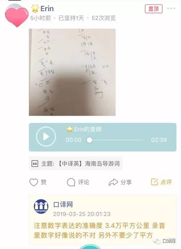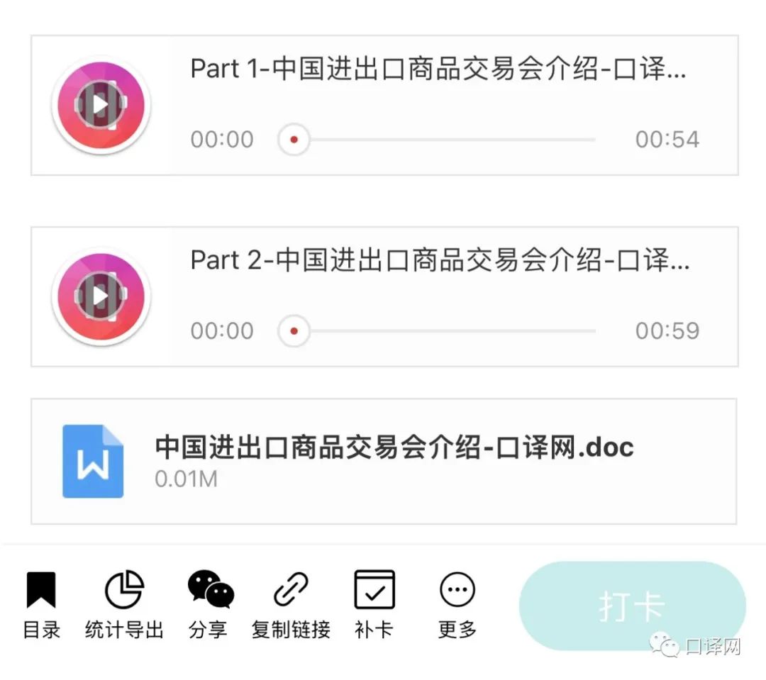 口译打卡:每天我们会在小程序中发布各类主题口译训练材料,资料已经上千篇,内容、时长、难度按照 CATTI 标准进行选材和编辑发布,会员可直接在小程序中播放音视频、学习双语文本,同时可将自己的口译录音并在小程序中提交保存,无需发到朋友圈,而且【交传】&【同传】都能练哦!大家彼此督促鼓励、互相学习交流进步!