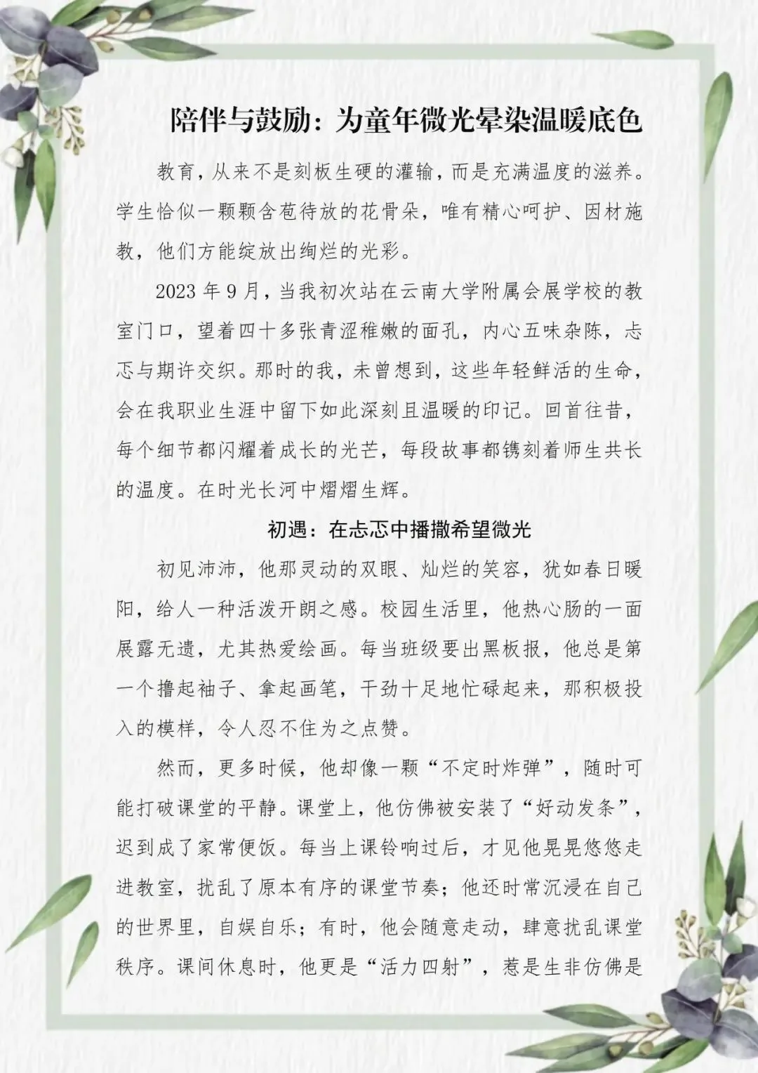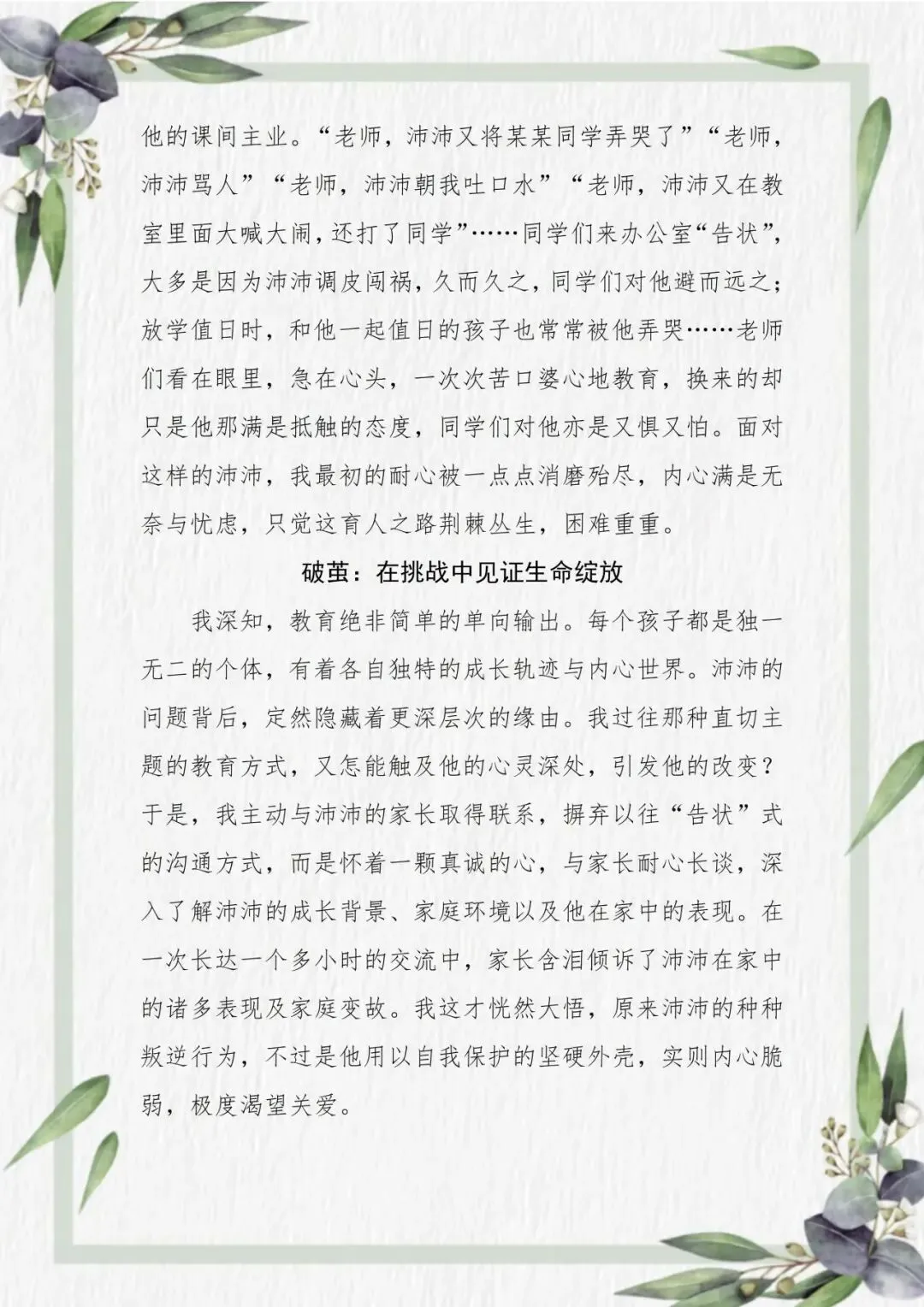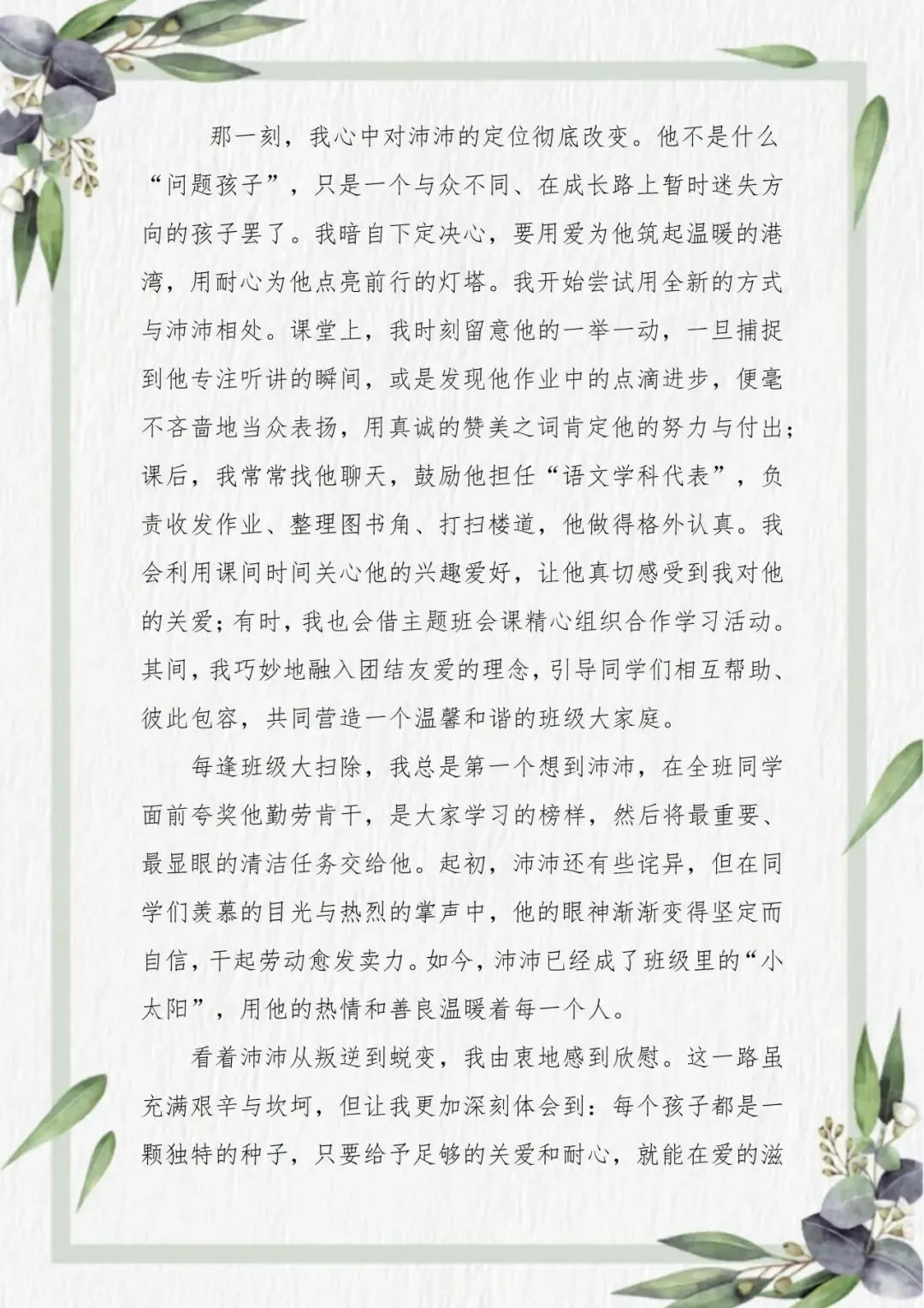 方芳老师以耐心为灯,照见成长的微光。她的教育故事,始于一次真诚地俯身与倾听。面对那个如“不定时炸弹”般令人忧心的孩子沛沛,她没有止步于表象的批评,而是走进他的家庭与内心,在叛逆的外壳下触摸到一颗渴望被看见的柔软心灵。从此,她以信任为桥,以鼓励为帆,将责备化为期待,把疏离转为亲近。当沛沛从课堂的“扰乱者”成长为班级的“小太阳”,方芳老师用行动印证:教育最美的回响,莫过于用陪伴唤醒自信,让每段童年都浸染温暖的底色。