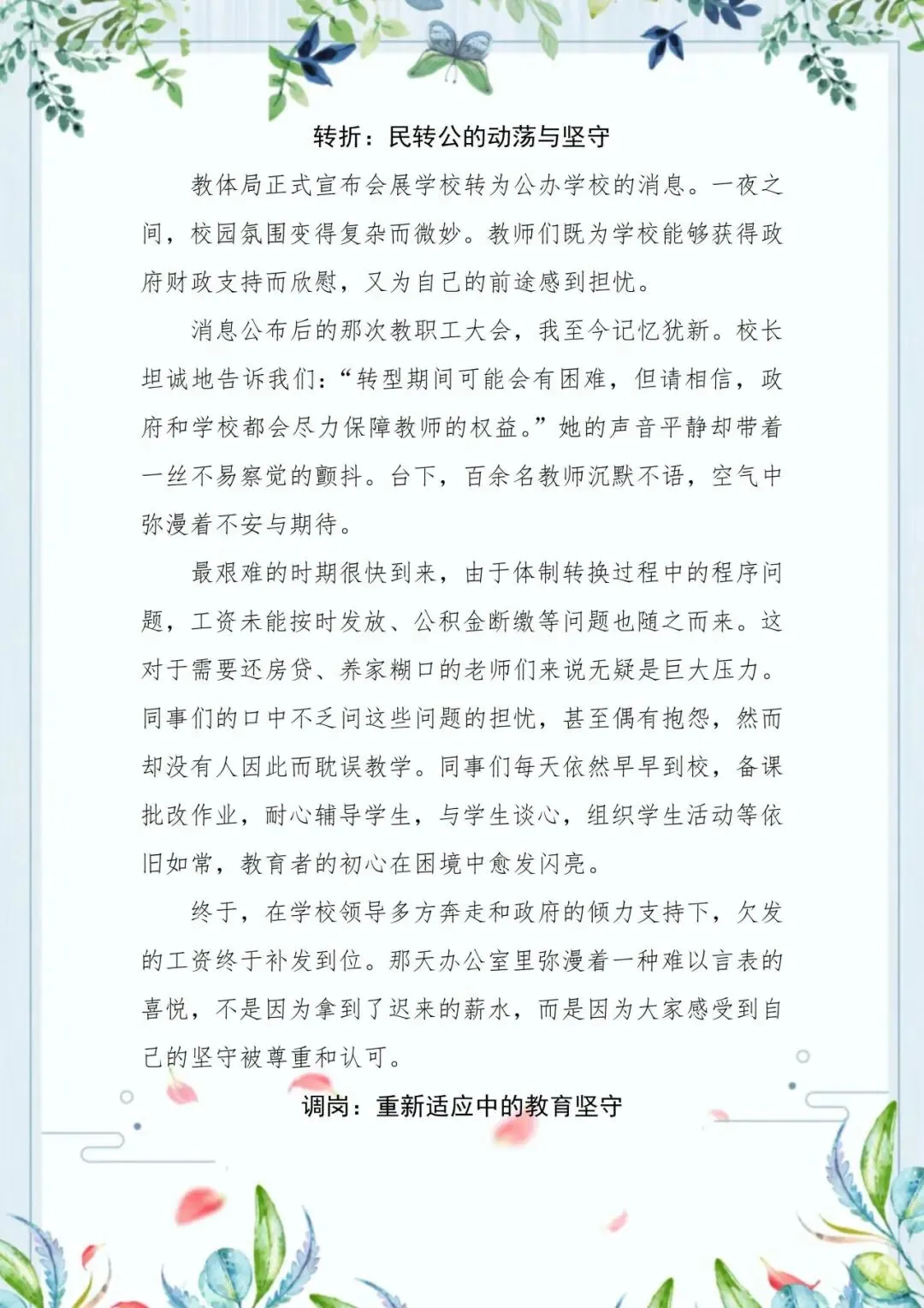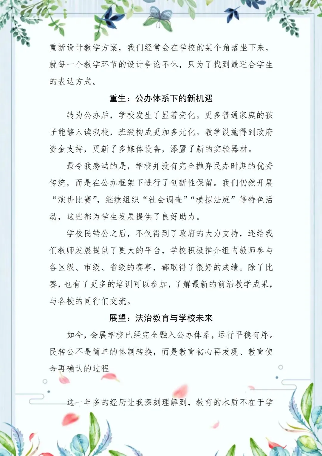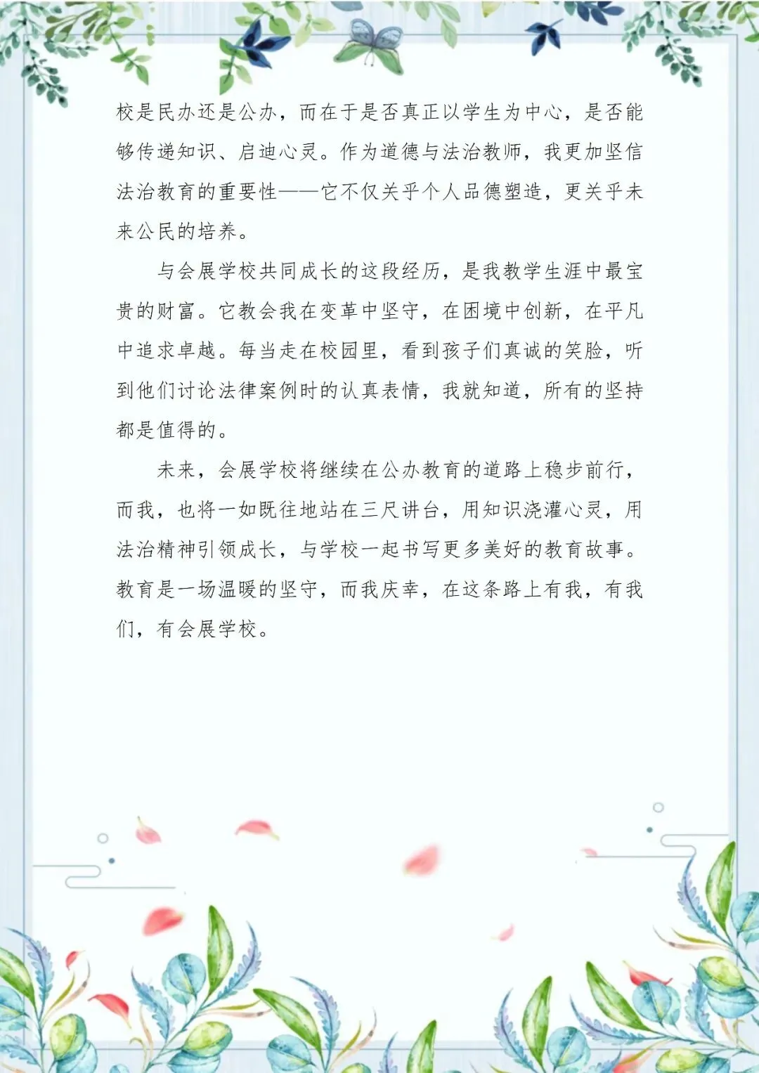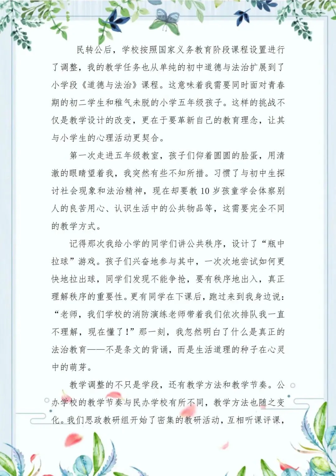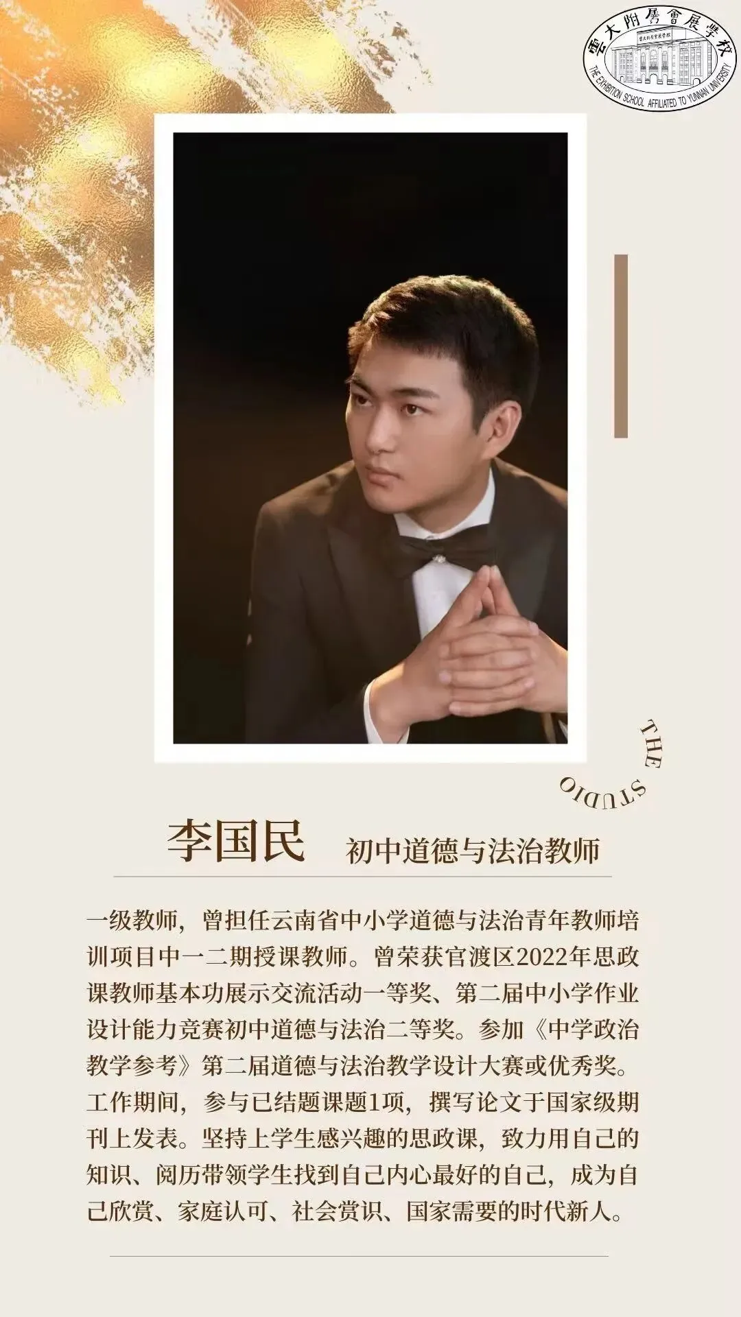 李国民老师在变革的浪潮中,做一枚沉稳的锚。当民办转公办的变革之风席卷校园,他面对着各种各样的压力,但他始终坚定如锚般扎根会展的课堂。从初中生的法治思辨,到小学生的规则启蒙,他让法治的种子在游戏中发芽,在生活里扎根。转型的阵痛未曾模糊他眼里的光,反而淬炼出更从容的担当。李国民老师的身影,是那段特殊时光里静默而坚韧的注脚,诠释着何为“体制可变,初心不迁”。