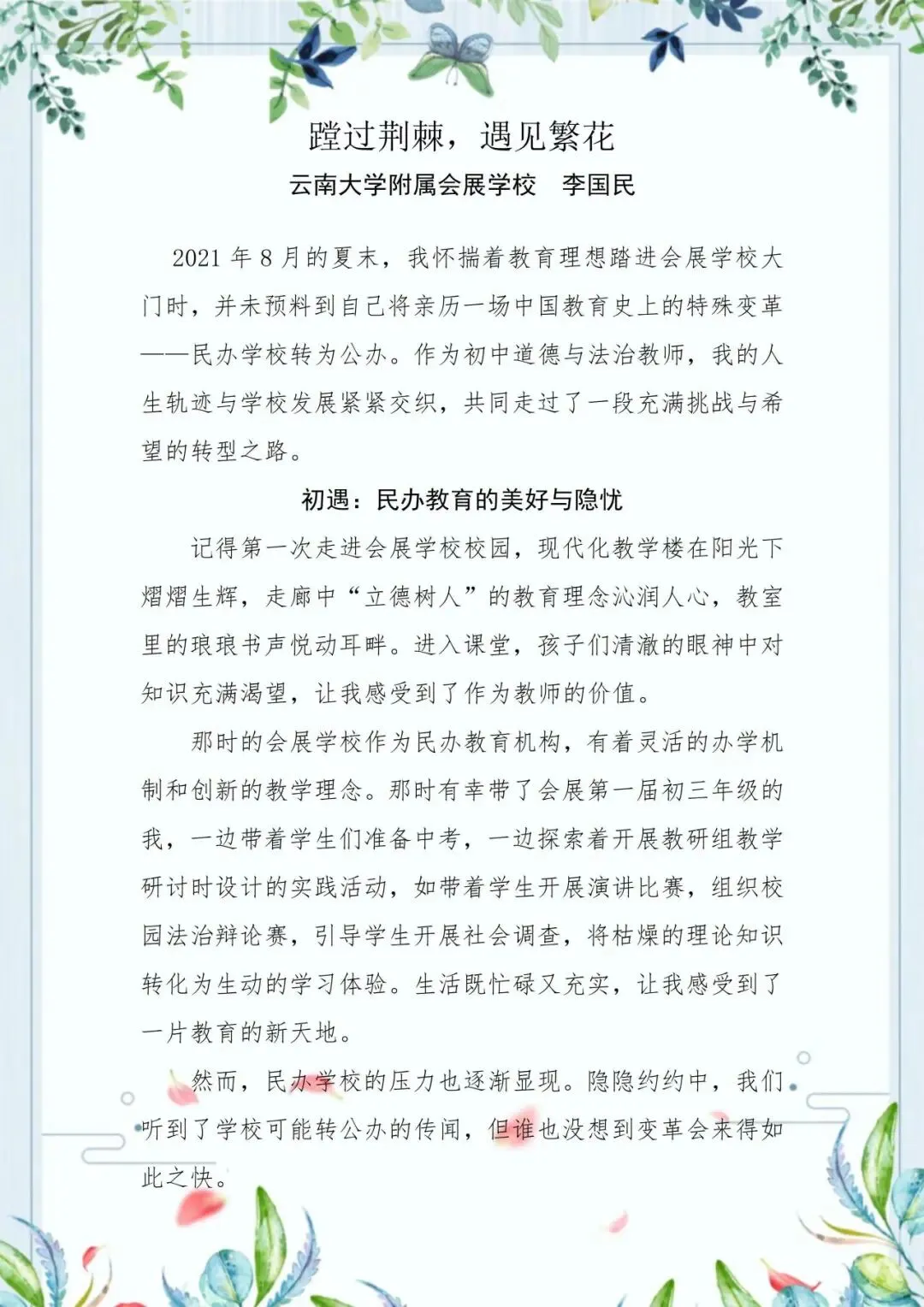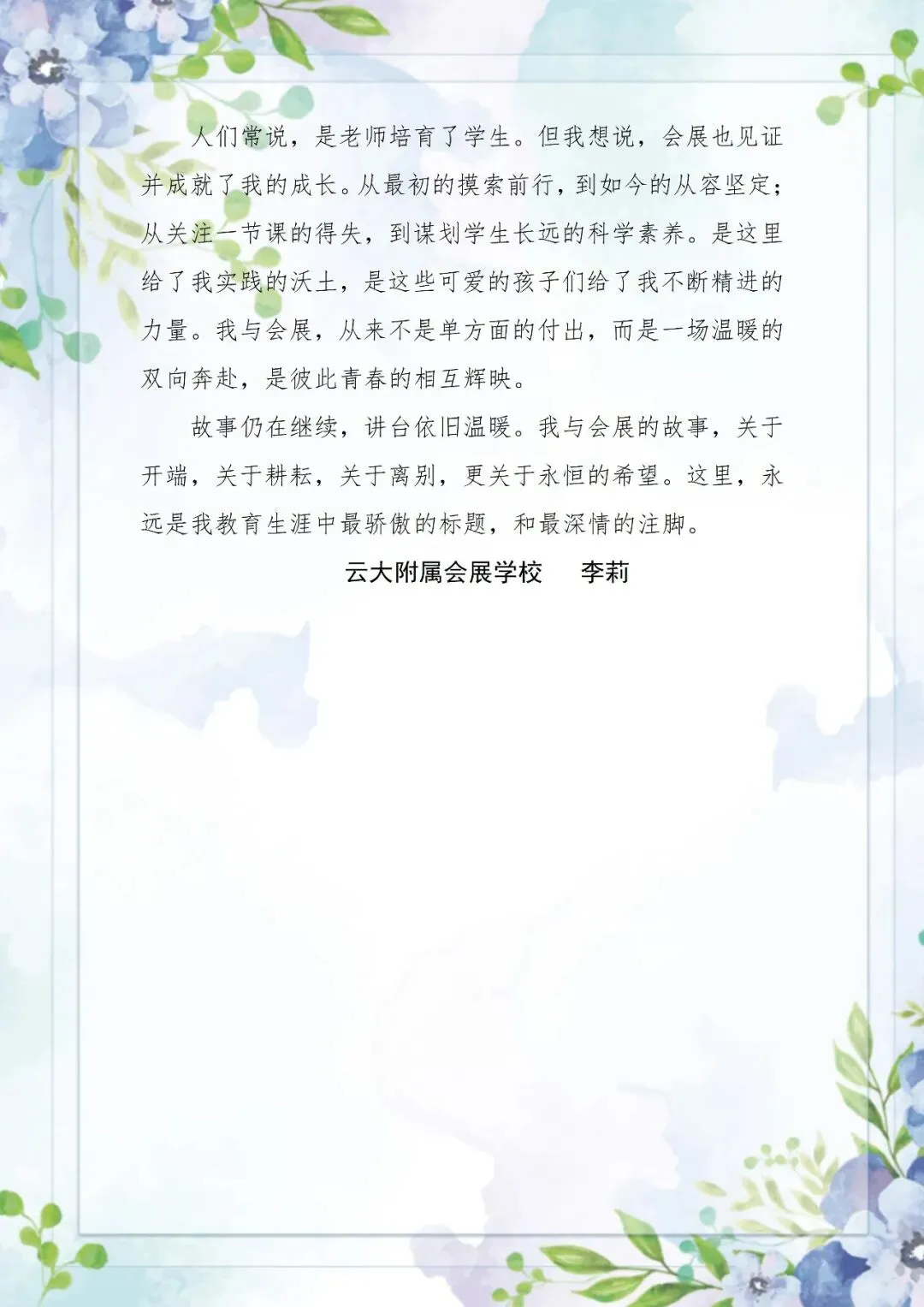 杏坛征途漫漫,育人薪火长燃。方芳的耐心如春雨,李国民的坚守如磐石,李莉的开拓如星火,他们以不同的姿态,共同丰盈着云南大学附属会展学校的教育故事。愿这些故事继续生长,愿这份初心永远鲜活——在教育的长卷上,我们继续书写,温柔而坚定,平凡而闪光。