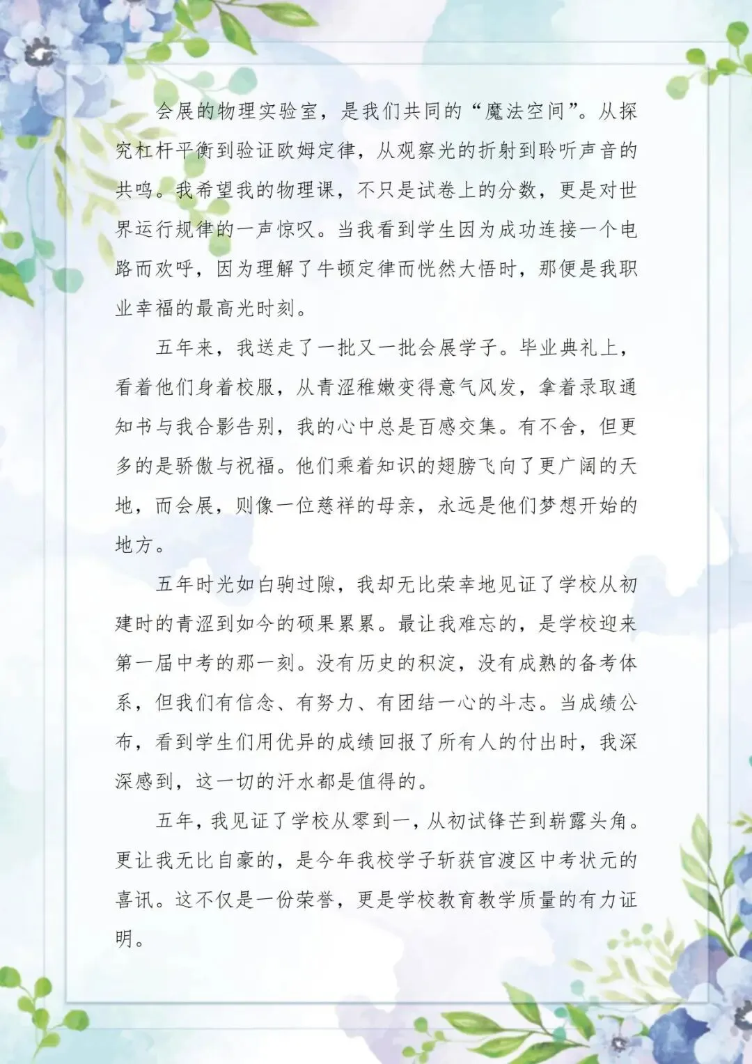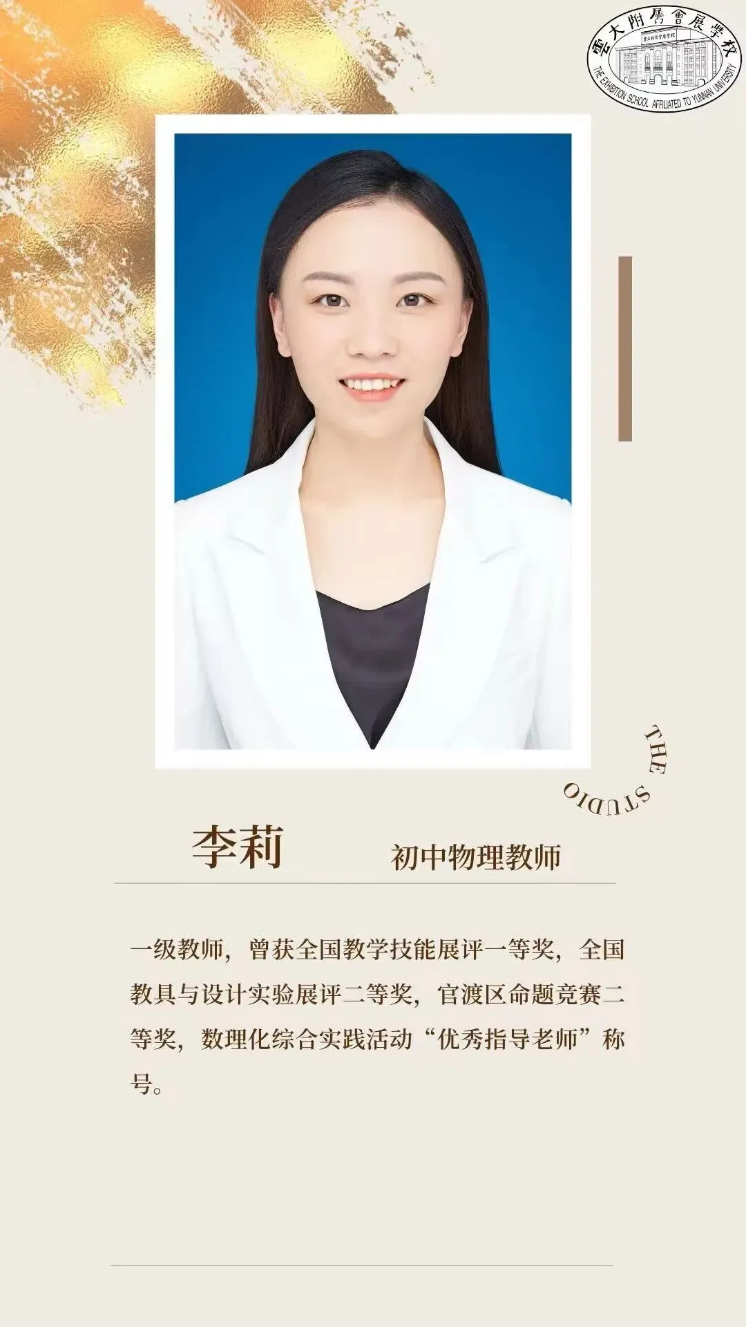 李莉老师与学校共生长,她是会展物理学科的“拓荒人”,在无教案可循、无旧例可依的初年,于空荡的实验室里带学生体验物理的魔法。连续四年守望初三,她见证清晨背诵公式的侧影,陪伴黄昏争论题目的面庞,也将物理的魔法,化作学生眼中惊叹的光。从首届中考的破土,到区状元的摘冠,她与会展彼此成就,共赴一场温暖的双向奔赴之旅。李莉老师的五年,是开拓者的五年——白纸作画,笔笔皆成序章;青春相伴,步步尽是回声。
