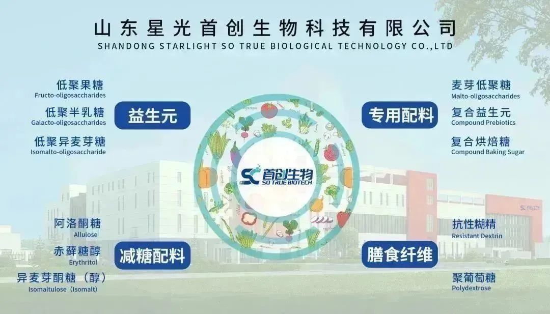 由星光集团旗下山东首创生物科技有限公司自主研发的星畅道产品成分为低聚果糖,具有流动性好、水分活度低、高纯度、益生功能好等优良特性,可广泛应用于食品、保健、酒类、化妆品及饲料等领域,在肠道内可有效促进有益菌的生长繁殖,调节肠道内微生态平衡,使人体更畅快健康。壹倍甜零卡糖由赤藓糖醇和天然罗汉果甜苷复配而成,溶解性能优,与蔗糖甜度等量,热量却极低,更适合糖尿病人食用,适用于餐桌甜味料、饮料、糖果、糕点、风味发酵乳、蜜饯凉果等产品制作。壹倍甜产品甜味纯正,无不良后味,是蔗糖平替的最优选择。