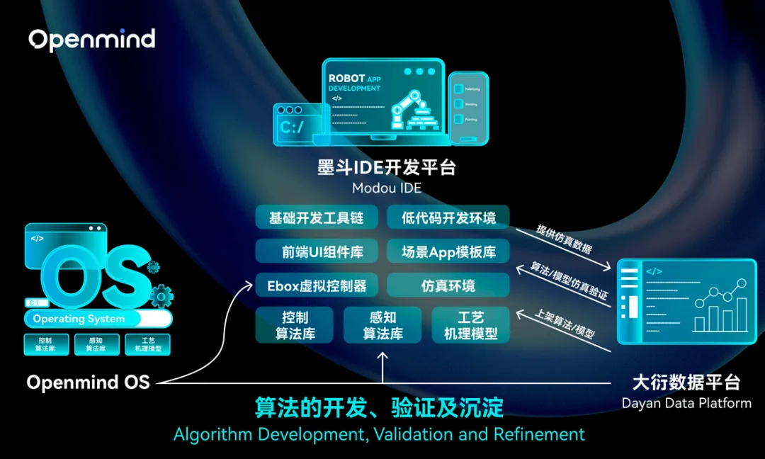 通用技术底座提供更高效的开发工具链(墨斗IDE)、操作系统(Openmind OS)和大衍数据平台,支持多种机器人构型,让机器人技能APP开发过程门槛更低、成本更低、效率更高,同时它也是RaaS模式重要的技术实现基础。
