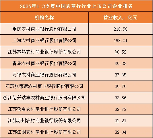 根据申万行业分类,2025年1-3季度中国农商行行业上市公司按营业收入排名如下:(A股上市公司)