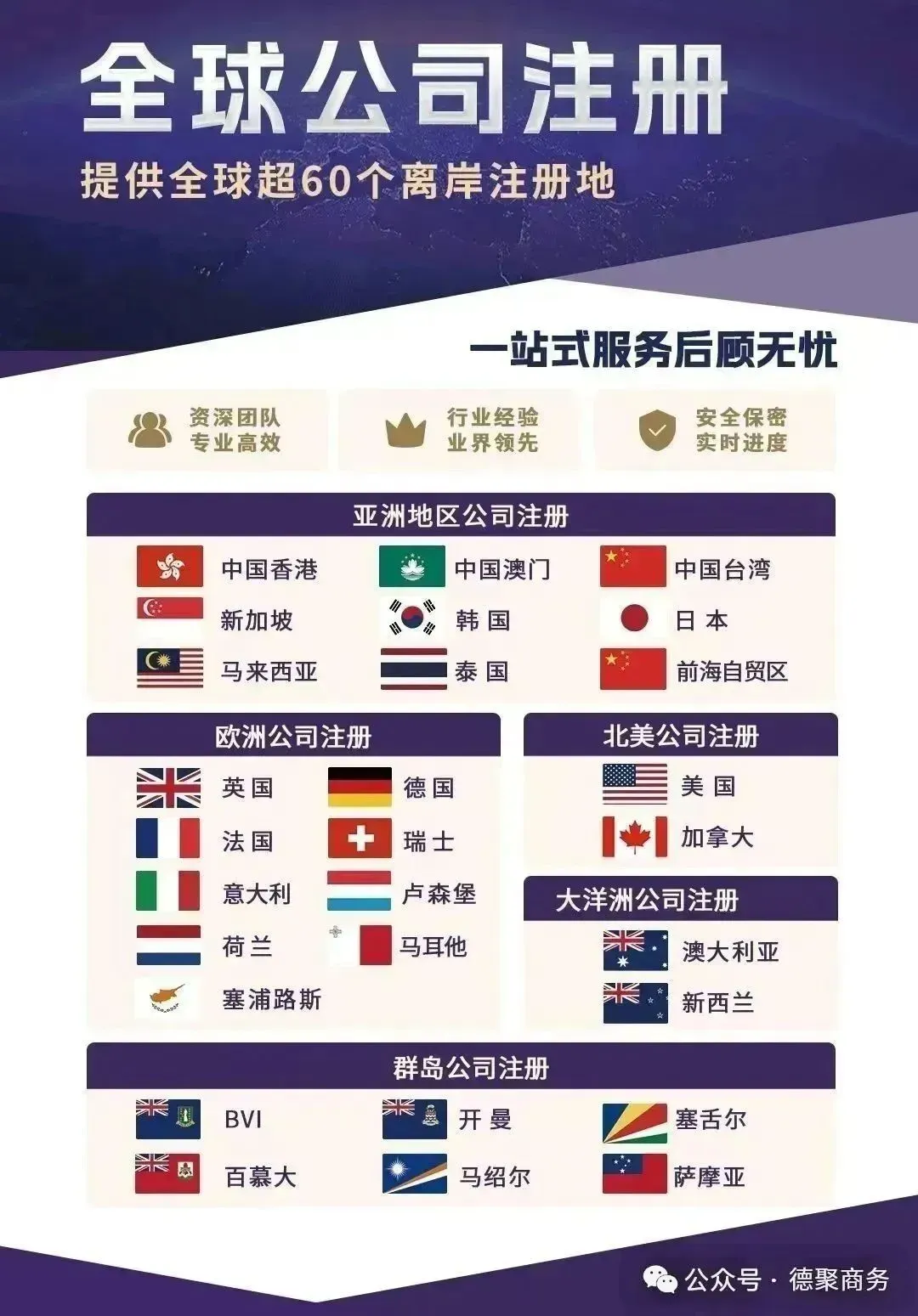 德聚商务国际企业我司作为一站式跨境合规服务商,专注全球200多个国家及地区的全球企业注册及秘书服务、涉外工商服务、国际税务筹划、海外架构搭建、全球知识产权服务的一站式出海服务,多对一式管家服务,专业为您定制一站式出海解决方案,成就行业好口碑。