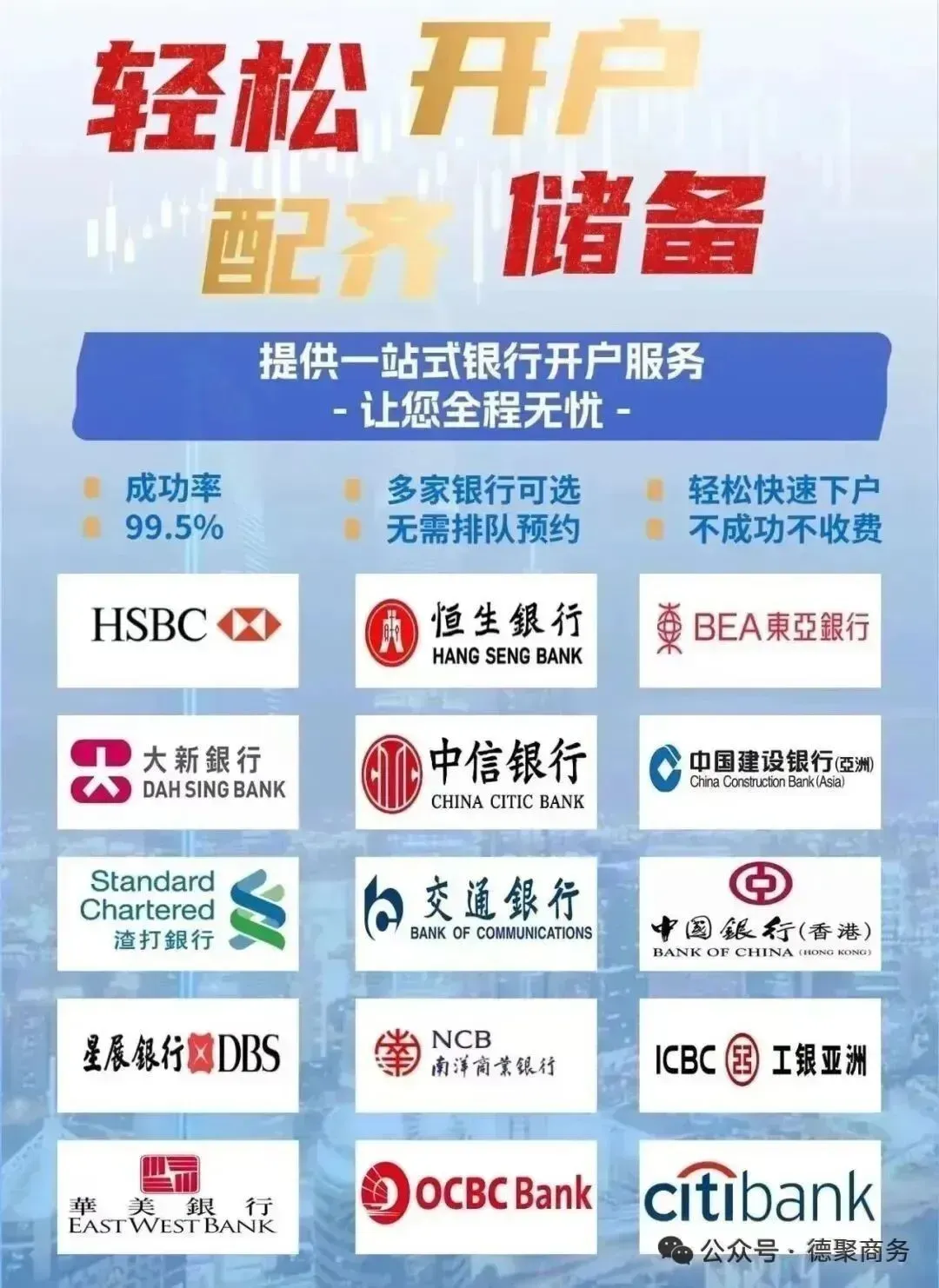 由于不同银行要求不同,建议大家直接联系德聚商务(微信号:13113010927),了解具体开户所需资料,确保准备充分,一次通过。