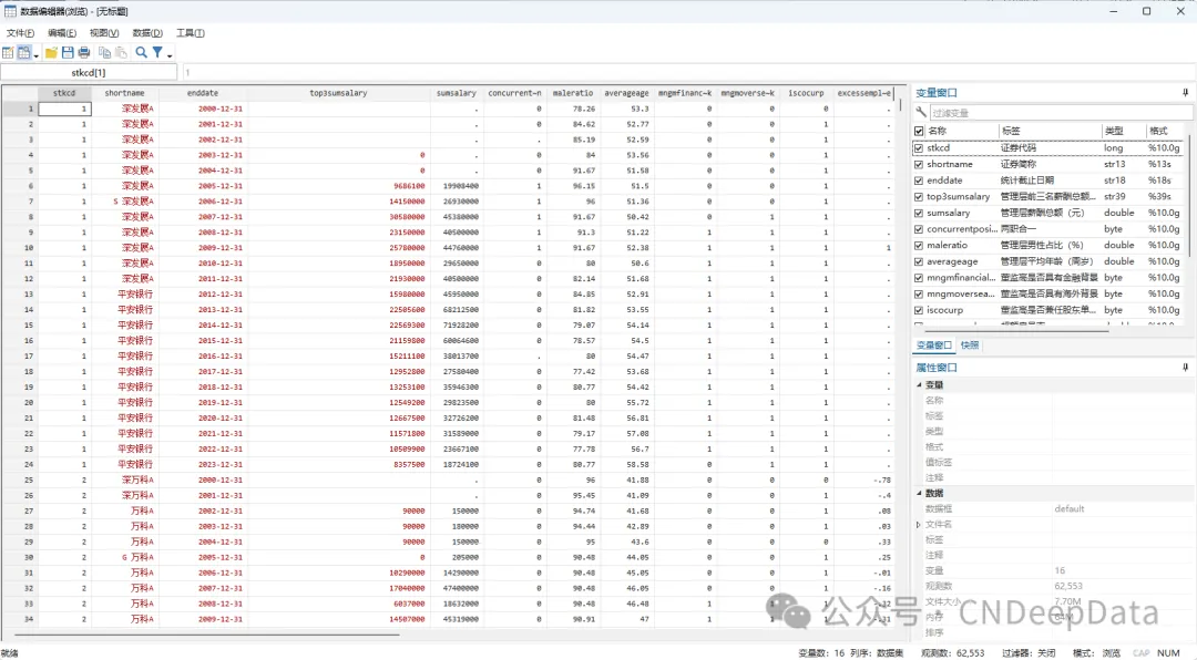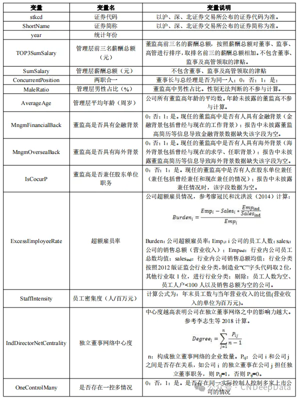 ▪ 数据说明:CNDD上市公司调研活动机构信息包含管理层前三名薪酬总额(元)、管理层薪酬总额(元)、两职合一、管理层男性占比(%)、管理层平均年龄(周岁)、董监高是否具有金融背景、董监高是否具有海外背景、董监高是否兼任股东单位职务、超额雇员率、员工密集度(人/百万元)、独立董事网络中心度、是否存在一控多情况等变量。提供excel和stata两种打开形式。