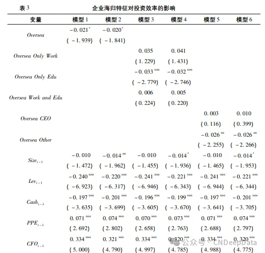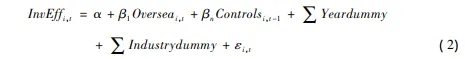 其中,InvEff 为企业的投资效率,其取值越小表明投资效率越高。Oversea 是企业 海归特征的虚拟变量,若取值为 1,则表明企业在当年至少有一个高管或董事拥有海 外学习或工作经历,否则取值为 0。Controls 为一系列控制变量,Yeardummy 与 Industrydummy 分别为年度和行业虚拟变量,具体可参见前文定义。预期企业海归特征虚拟变量 Oversea 的系数 β1 显著为负。
