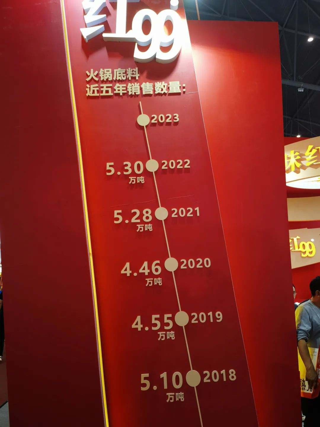 一方面,受疫情影响,包括火锅餐饮在内的火锅产业在去年面临巨大的挑战,这从行业龙头的经营表现中也可以窥得一二;另一方面,类火锅调料的崛起蚕食了火锅调料很大一部分市场份额。比如颐海国际,在2022年,该企业向关联方销售的火锅底料跌幅超过万吨。即便是在参展企业中领跑的红九九,根据其展位上透露的信息显示,2020年至2022年,红九九火锅底料销量分别为4.46万吨、5.28万吨和5.3万吨,虽然2022年仍处在增长态势,但相比往年,增速明显放缓。