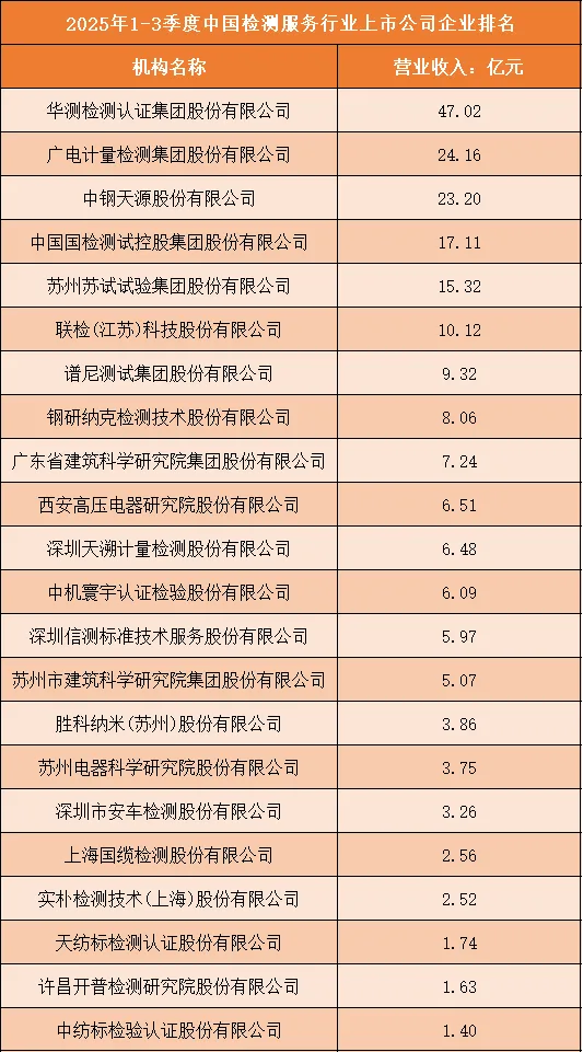 根据申万行业分类,2025年1-3季度中国检测服务行业上市公司按营业收入排名如下:(A股上市公司)