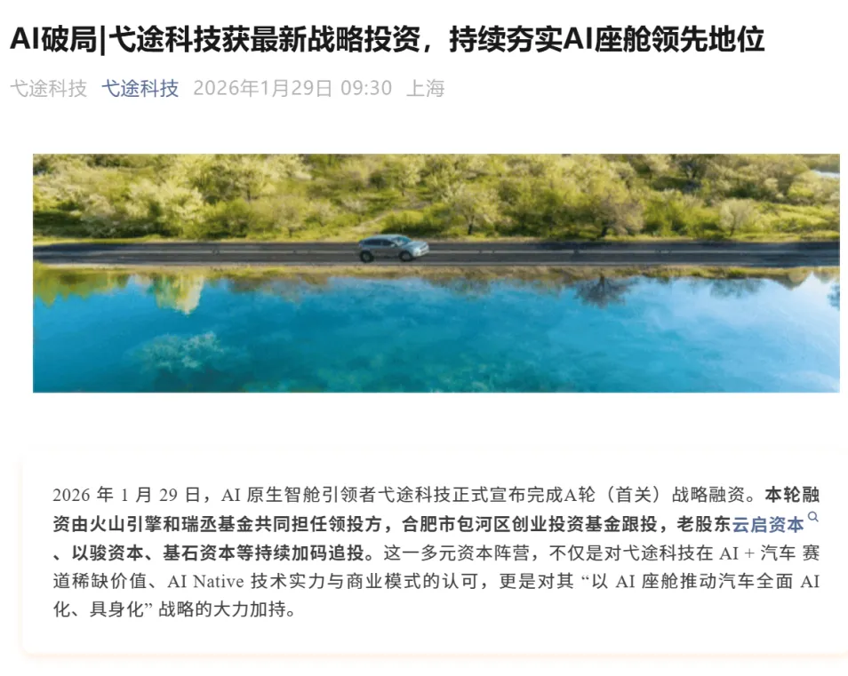 1月29日,AI原生智舱引领者弋途(深圳)科技有限公司(下文简称“弋途科技”)宣布完成A轮(首关)战略融资。本轮融资由合肥瑞丞私募基金管理有限公司(下文简称“瑞丞基金”)和火山引擎共同担任领投方,合肥市包河区创业投资基金跟投,老股东云启资本、以骏资本、基石资本等持续加码追投。