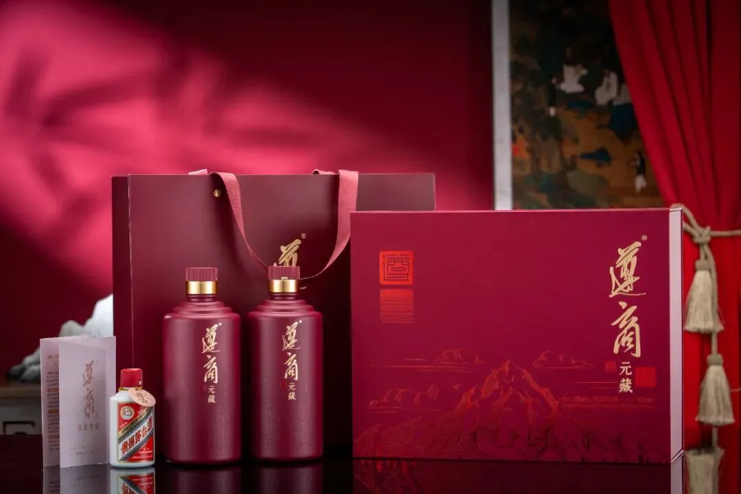 元藏产品采用绛红基底搭配鎏金雕琢的设计,体现酱酒陈藏的厚重与高端典藏的质感。礼盒上的贵州山水暗纹,凸显遵义核心产区的风土印记,完美契合商务礼赠的美学需求与身份象征。