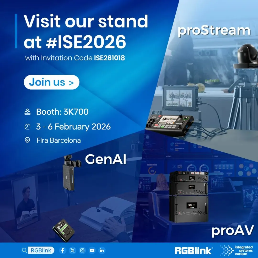 视诚 RGBlink logo 嘉宾姓名 + 身份条 ISE 2026 / Barcelona / Booth 3K700 等信息