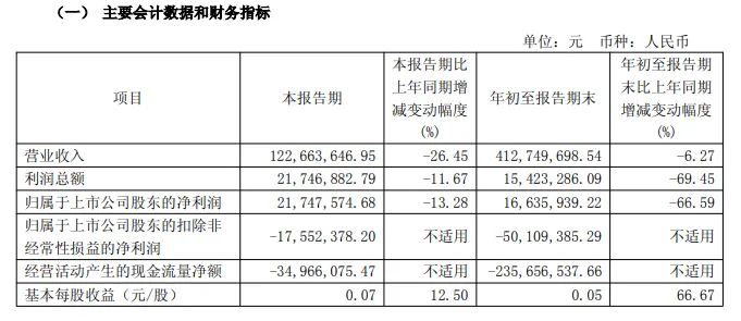 其中第三季度,公司营业收入为1.23亿元,同比下降26.4%;归母净利润为2175万元,同比下降13.3%;扣非归母净利润亏损1755万元,同比下降192.7%;