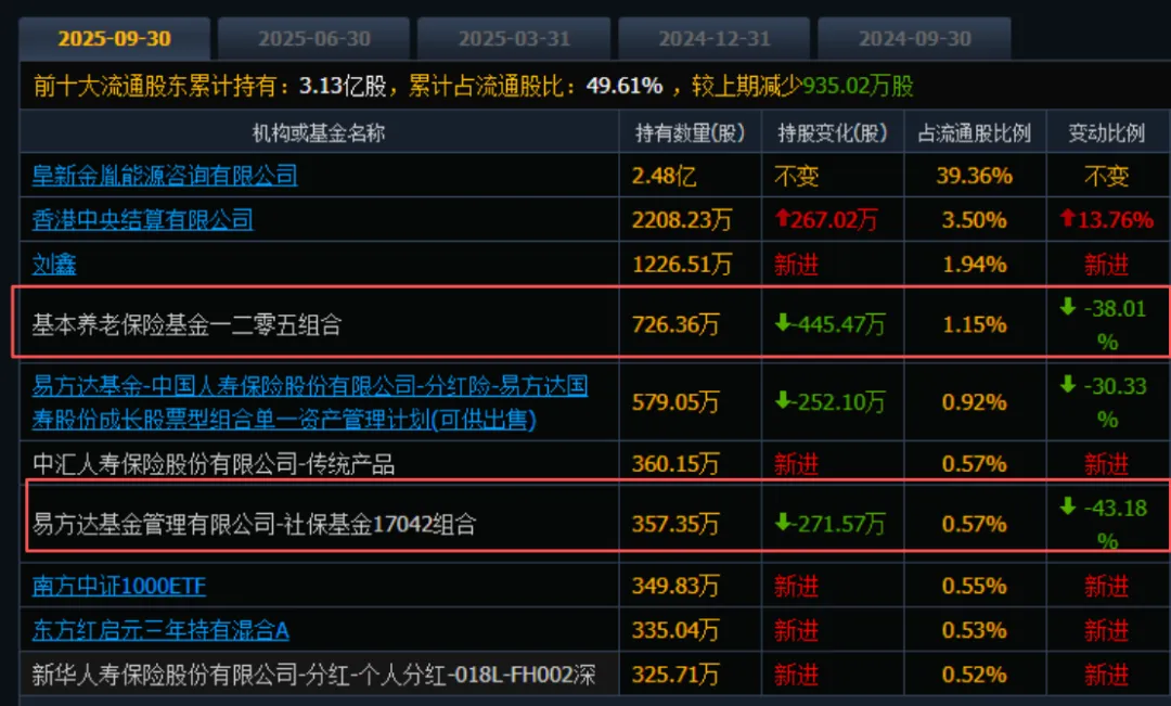 截止三季度,社保基金和养老基本均位于前十大流通股东。