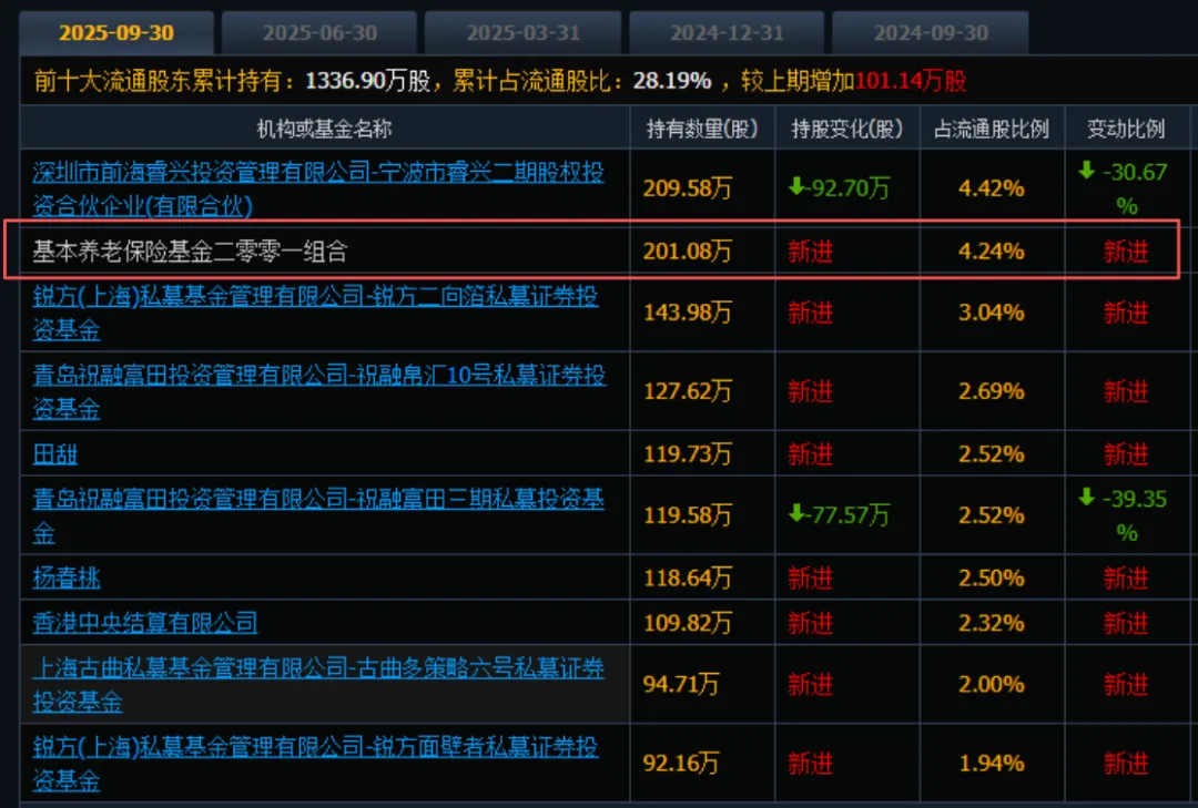 截止三季度,基本养老保险基金新买入201.08万股,位于前十大流通股东。